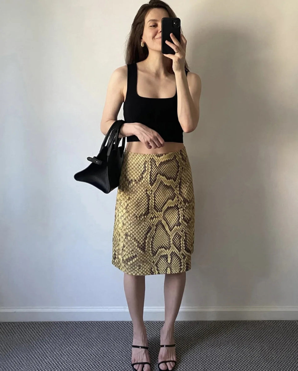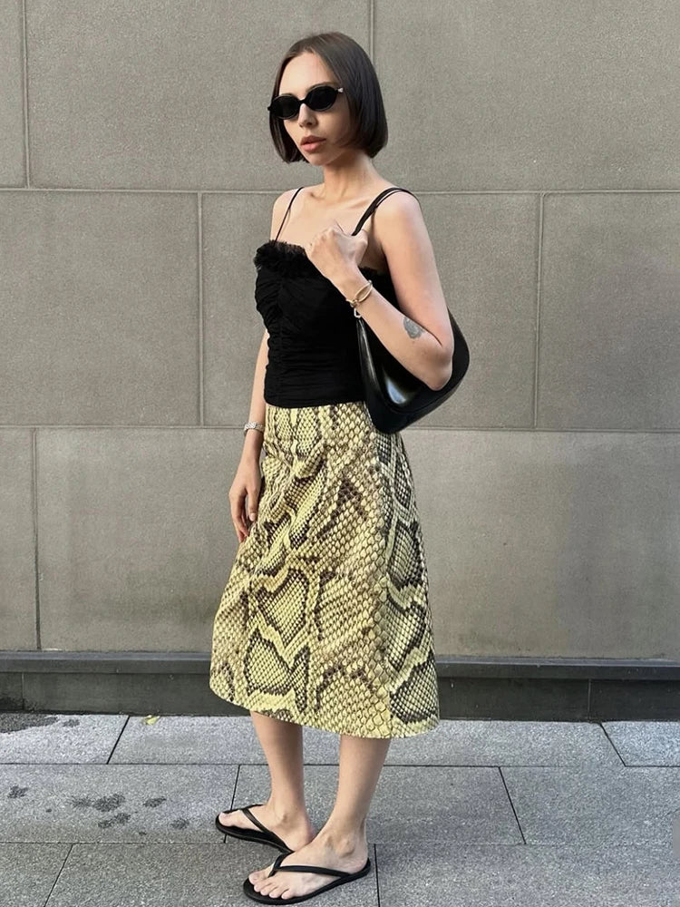 Design: A bold mid-calf skirt featuring a striking snake print, slim silhouette, and sleek straight cut that enhances curves with edgy flair.