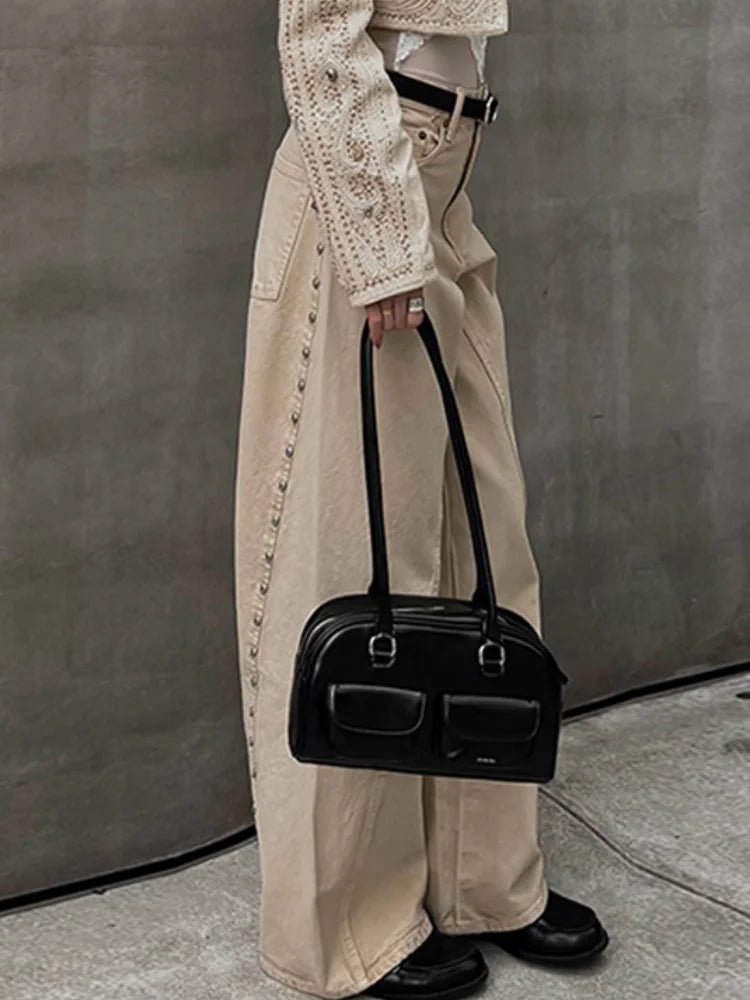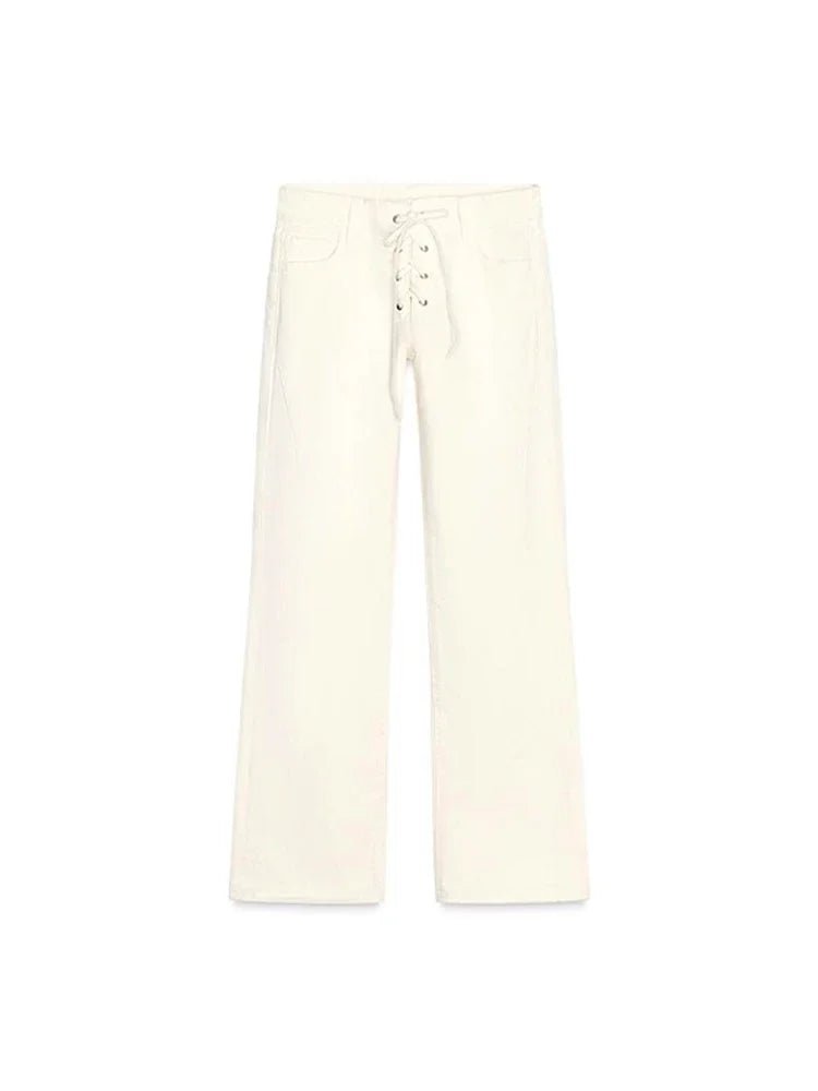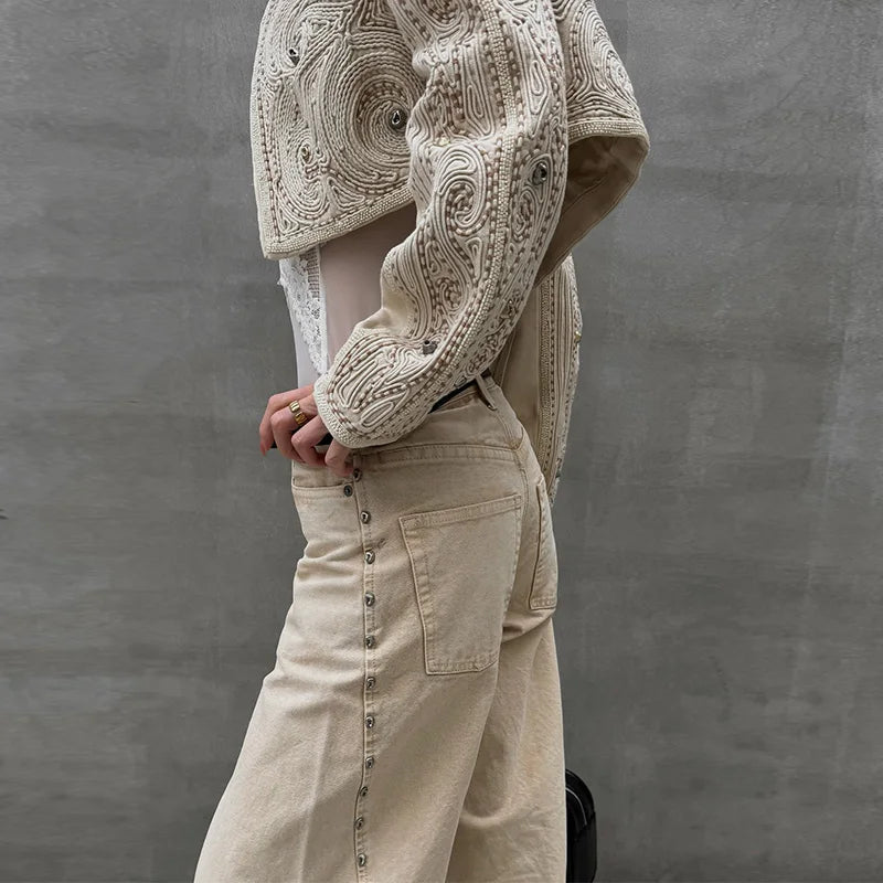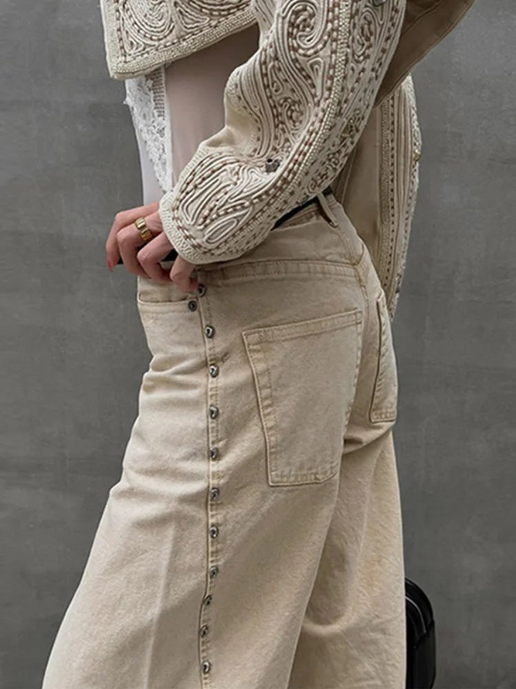 Design: Fashionable high-waisted pants with a straight-leg cut, featuring button accents, side pockets, and a drawstring closure for a relaxed yet structured look.