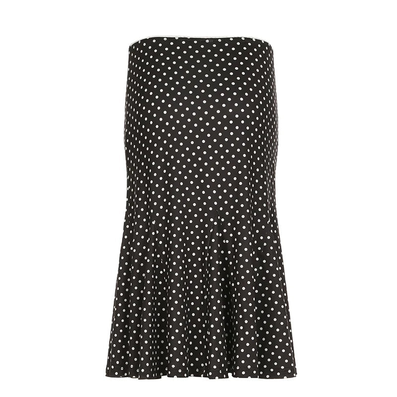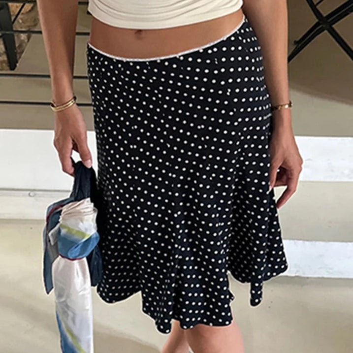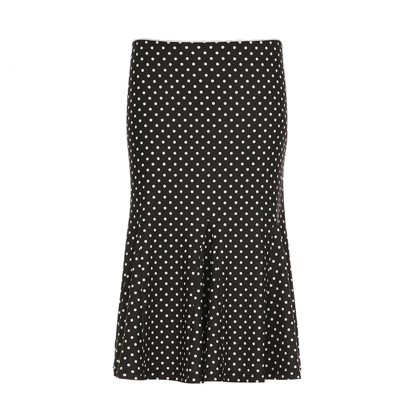 Design: A high-street style mid-calf skirt featuring a playful polka dot print, elegant wrap design, and ruffled hem. The trumpet silhouette adds a feminine, flowy touch.