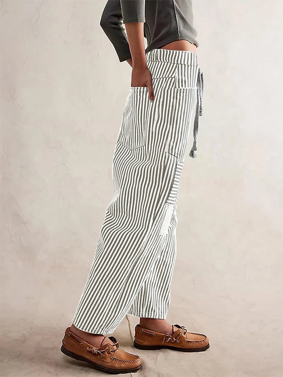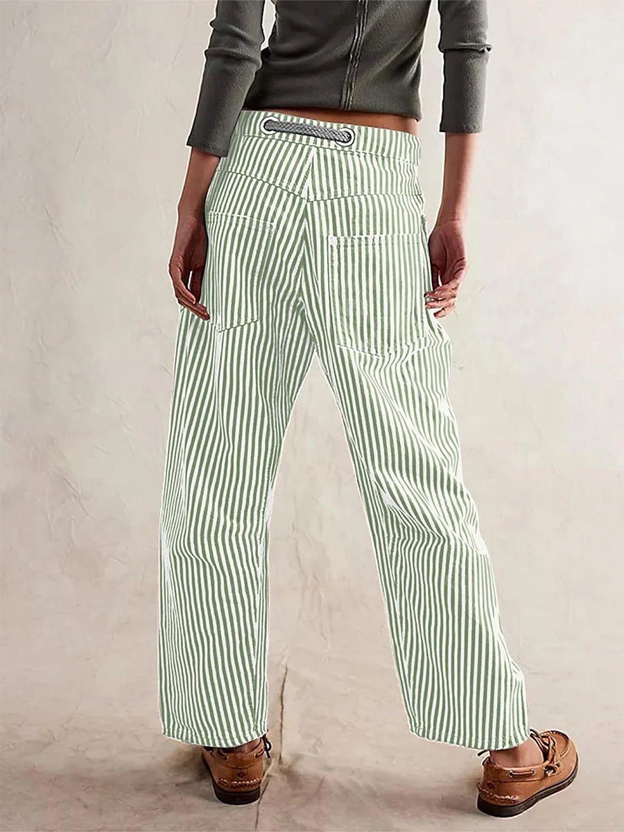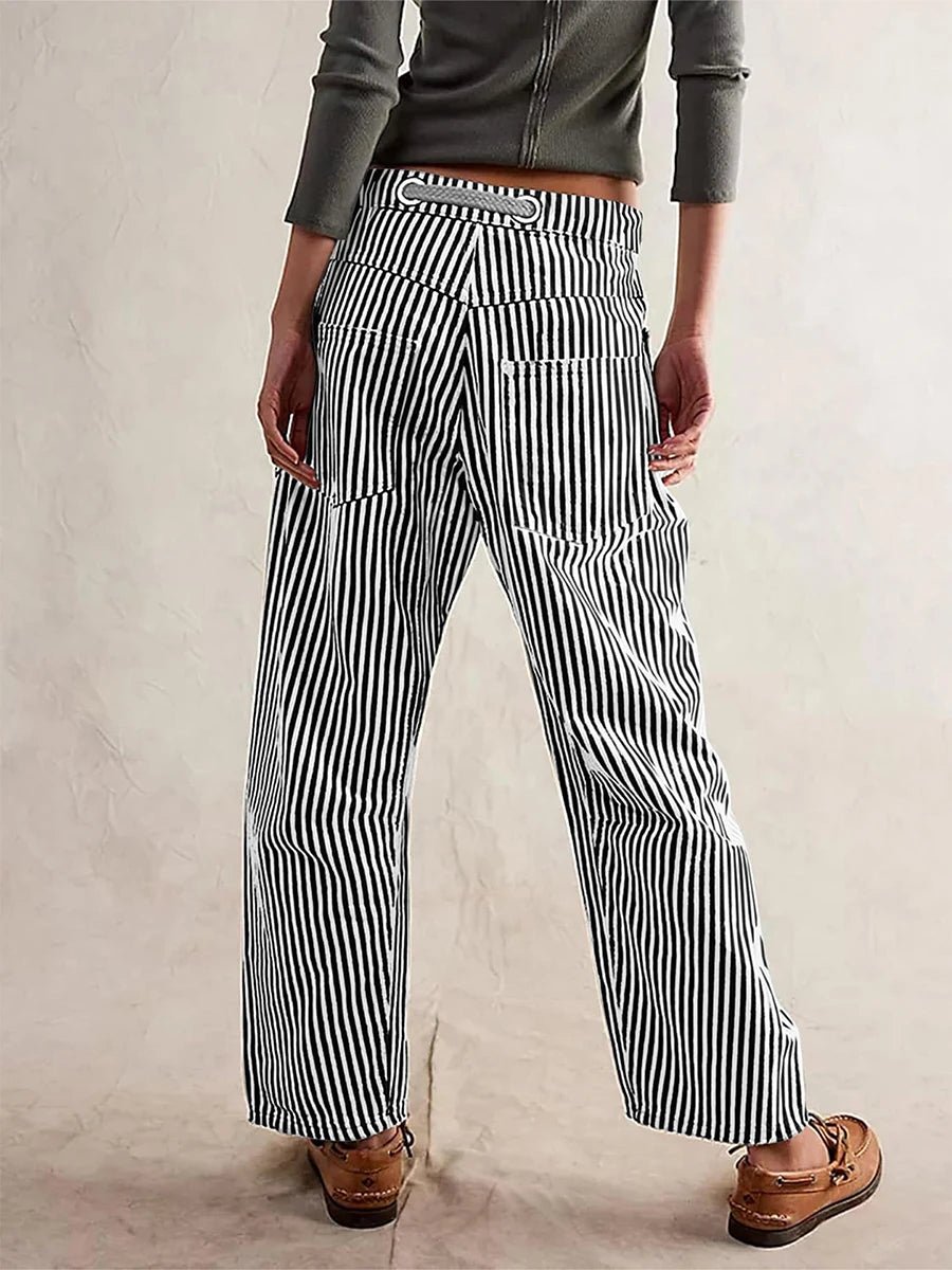 Design: Stylish full-length pants featuring a wide-leg silhouette with subtle vertical stripes for an elongated look. Designed with a flat front and comfortable elastic waist for easy wear, paired with a classic zipper fly.