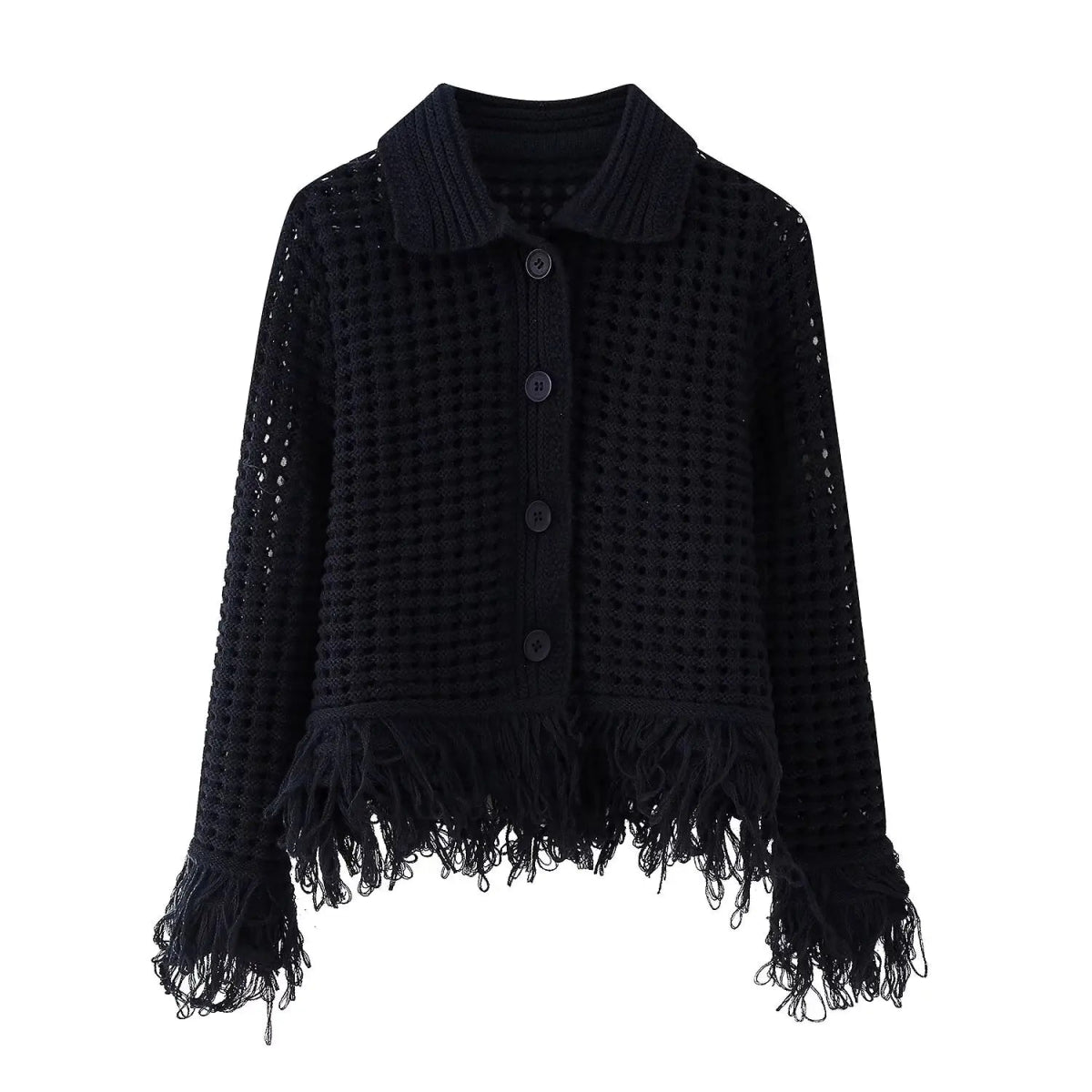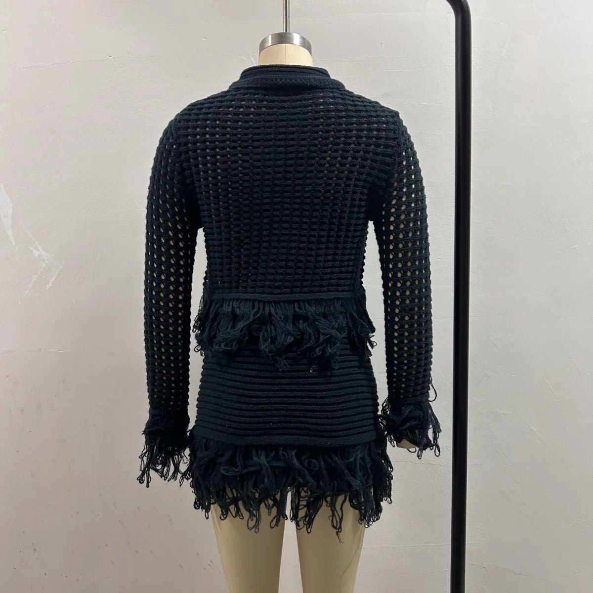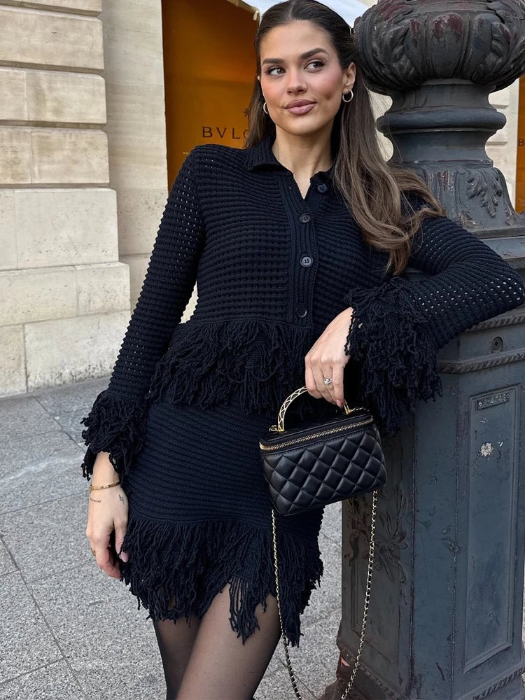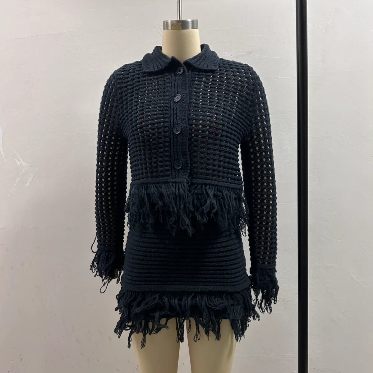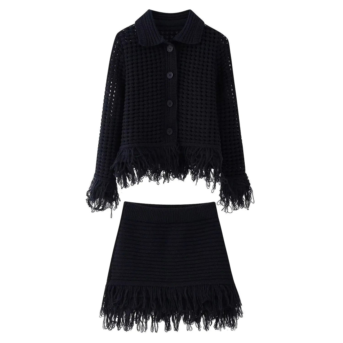Design: A stylish two-piece set featuring a slim-fit knit cardigan with a turn-down collar, button-front closure, and full-length sleeves, paired with a fringe mini skirt in a flattering A-line silhouette. The hollow-out detailing adds a trendy streetwear edge.