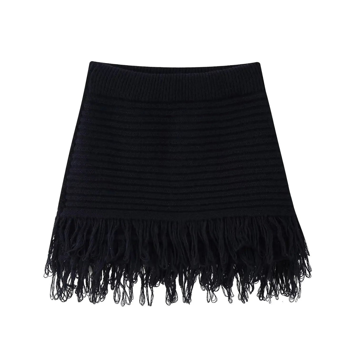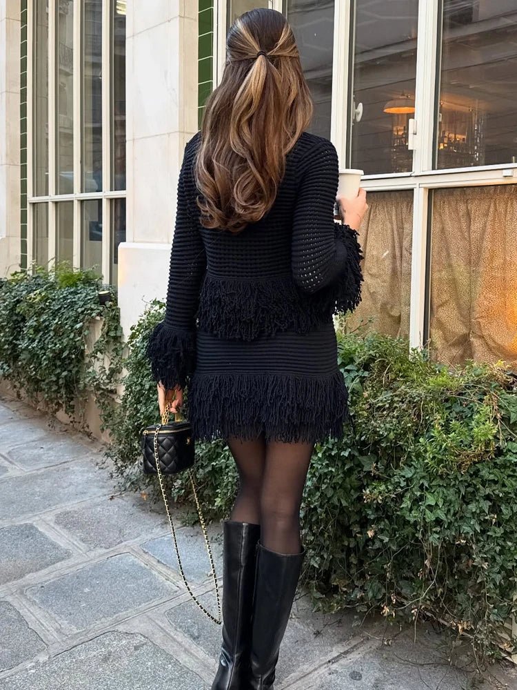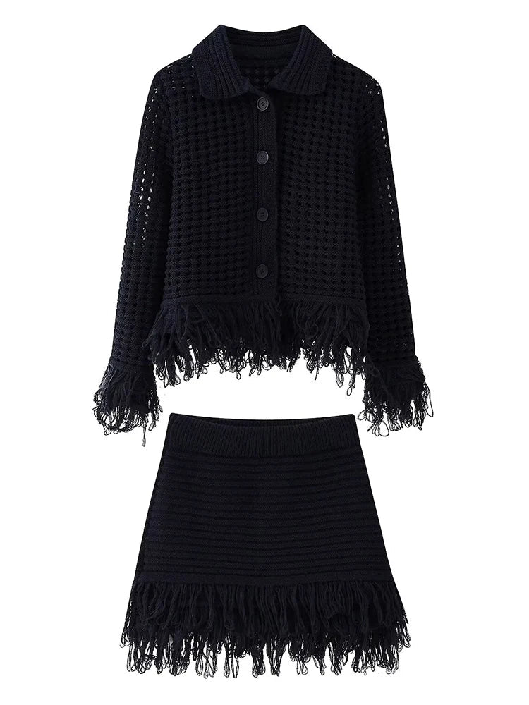 Hollow Knit Tassel Skirt Set