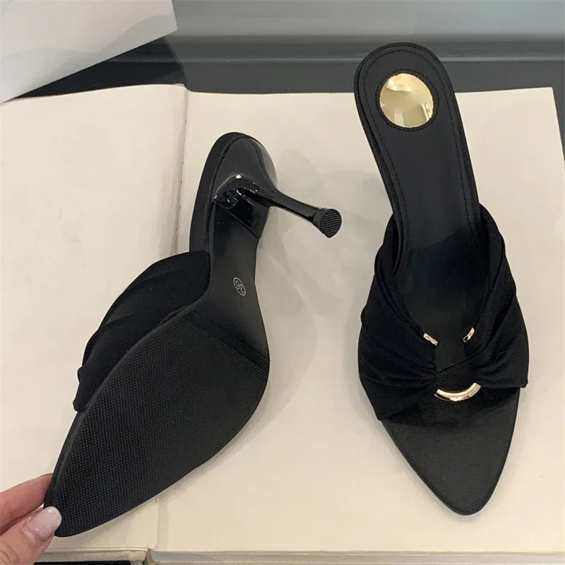 Design: A sleek and elegant pair of open-toe high heels crafted with smooth silk uppers, thin stiletto heels, and a minimalist pull-on style. The solid color and clean silhouette make these heels a timeless addition to any wardrobe.