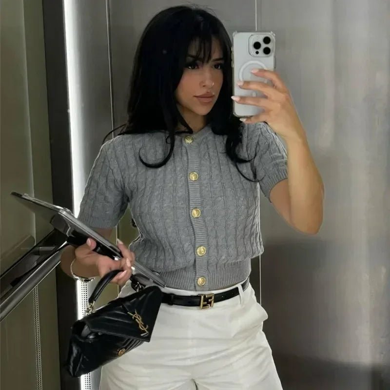 Design: A slim-fit knit top with a classic O-neckline, single-breasted button closure, and minimalist solid pattern. Its structured silhouette and stretchy comfort make it a streetwear staple for cooler days.