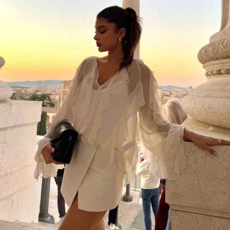 Design: A graceful ruffle-accented blouse with a flattering V-neckline and elegant stand collar. Full-length sleeves and a soft drape bring a romantic yet polished touch to everyday wear.