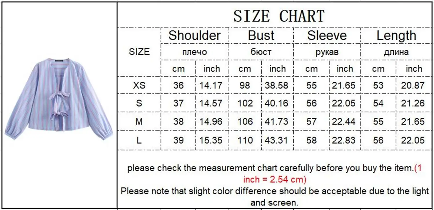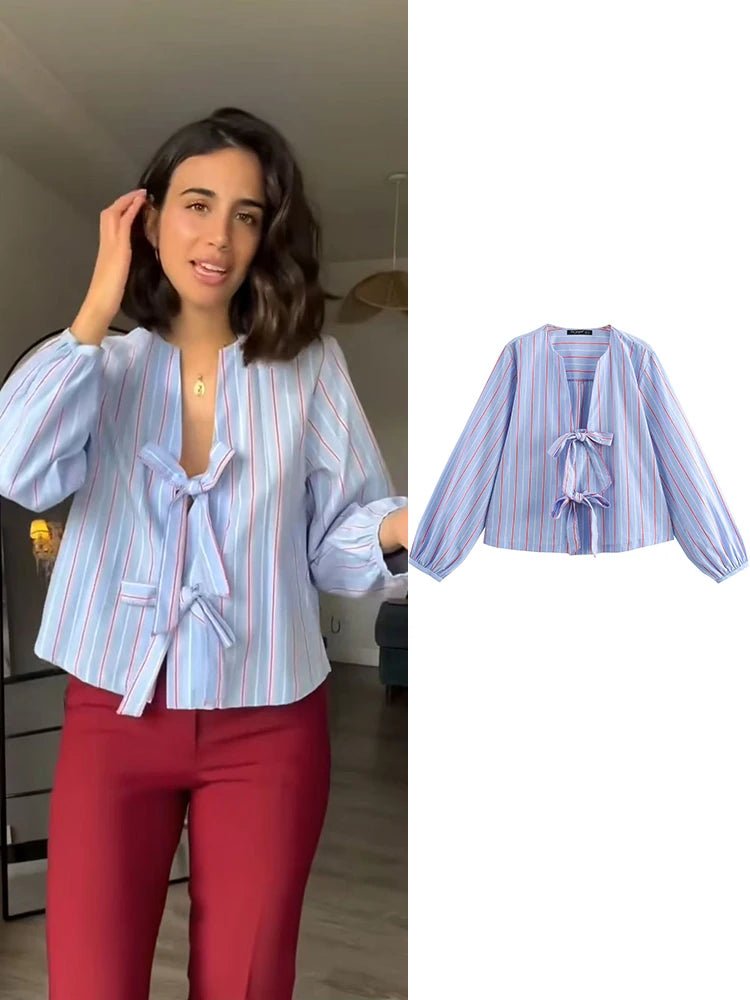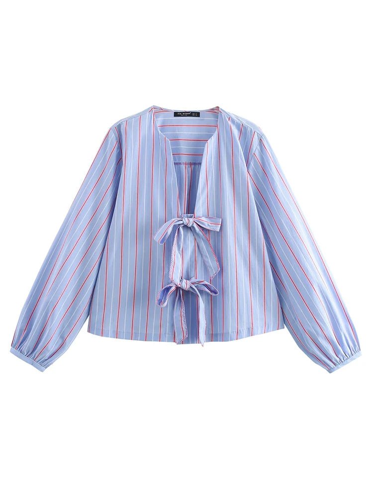 Long Sleeves Lace-Up Striped V-Neck Blouse