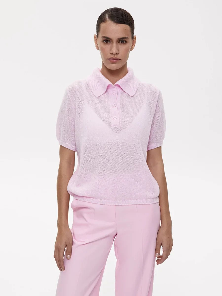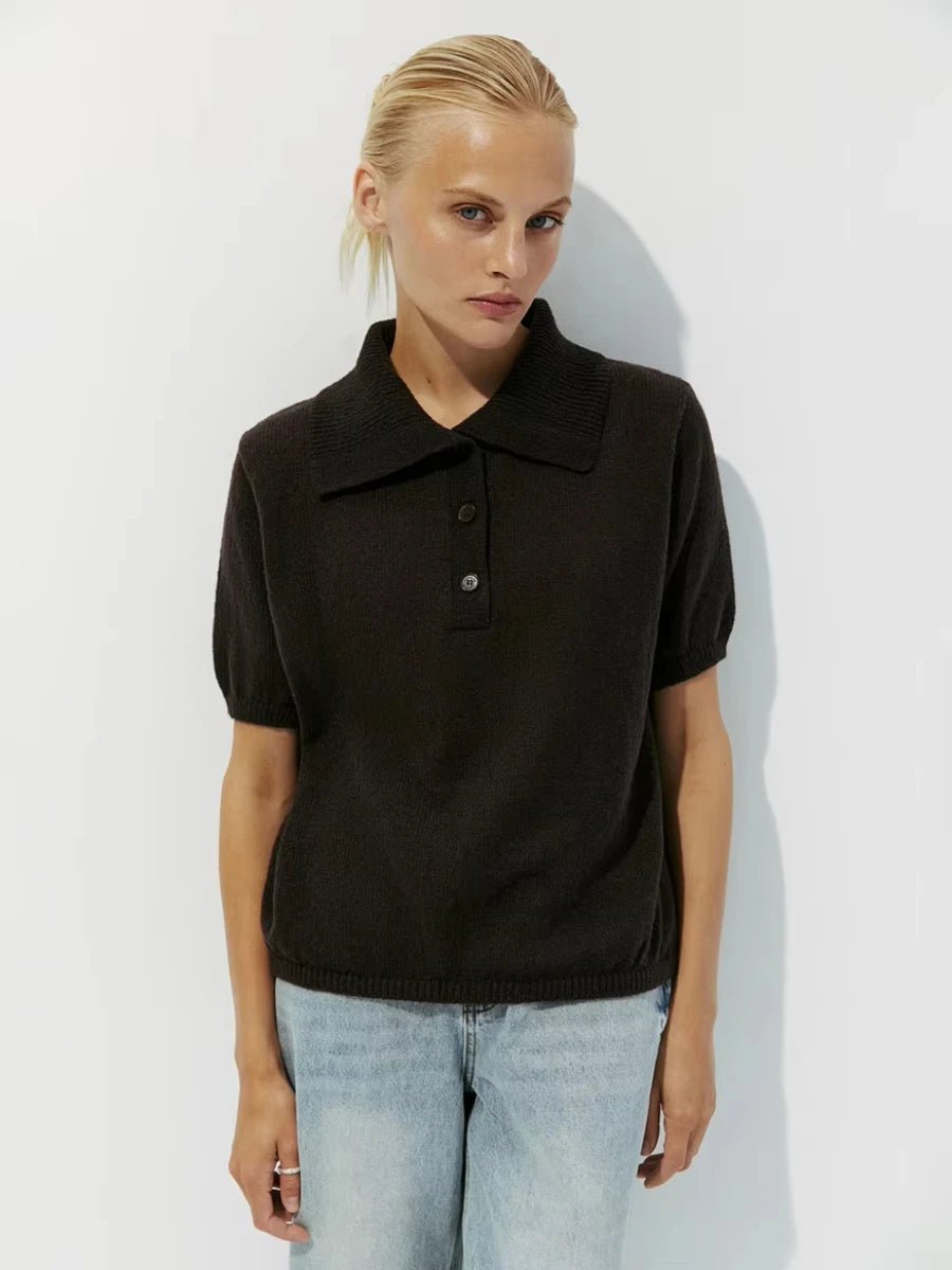 Design: A refined knitted polo shirt with a classic polo collar and short puff sleeves. The loose-fitting design offers both comfort and elegance, making it an ideal choice for professional office wear or chic casual outings.