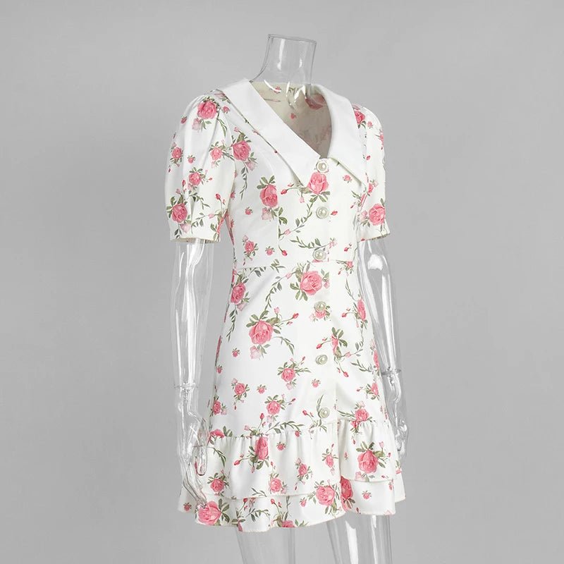Design: A sweet A-line mini dress featuring a vibrant print, V-neckline, puff sleeves, and pearl button accents. Ruffle details add playful charm to this high-waist silhouette.