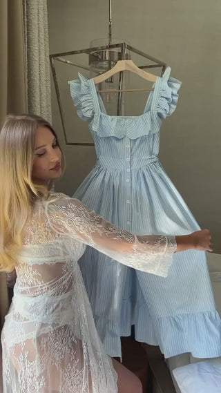 Design: A chic halter-neck dress with a flattering A-line silhouette, featuring playful flounced edges, a single-breasted front, and spaghetti straps for a breezy summer vibe.