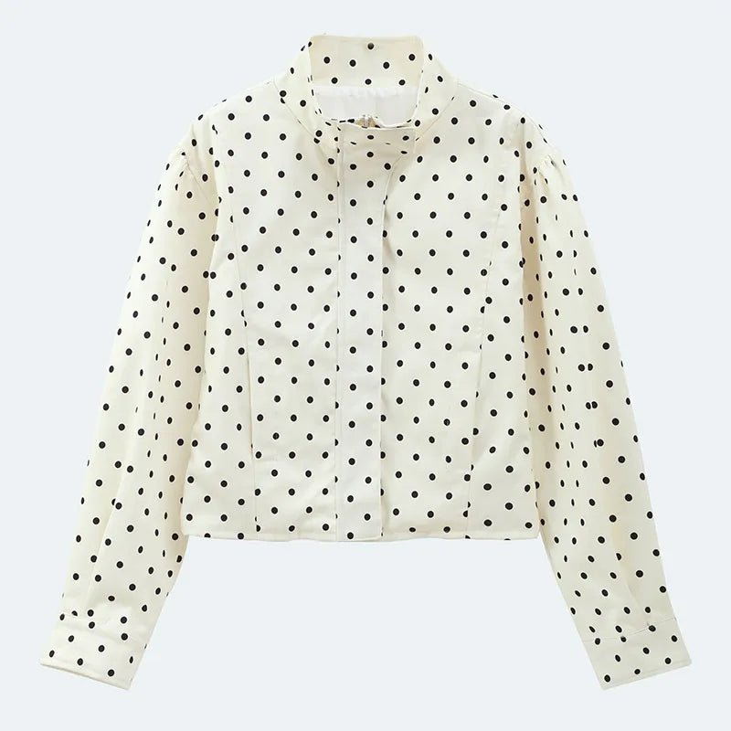 Design: A trendy jacket featuring a playful polka dot print, turn‑down collar, and front zipper closure. The patchwork design blends high street style with everyday wearability.