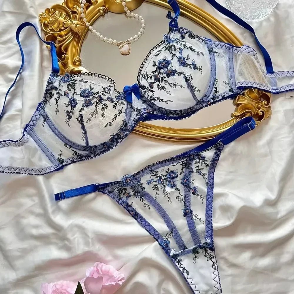 Design: A luxurious lingerie set featuring sheer mesh fabric with delicate floral embroidery, underwire support, and a three-quarter cup design. The matching brief and adjustable straps offer a comfortable yet sensual fit.