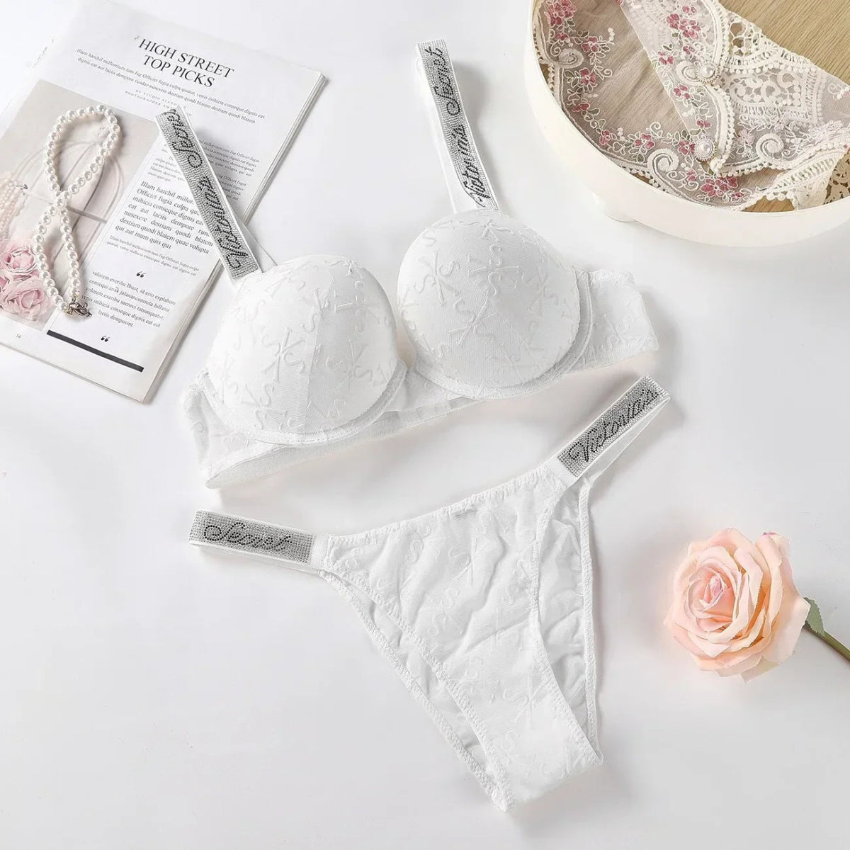 Design: A semi-sheer lace bra featuring delicate lettering, underwire support, and a classic two-hook back closure for a secure fit.