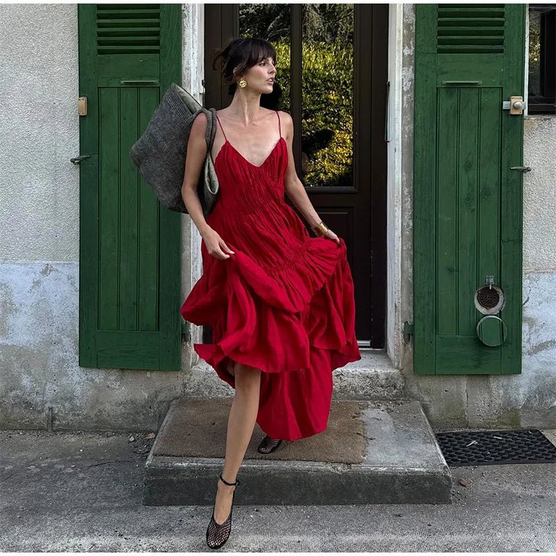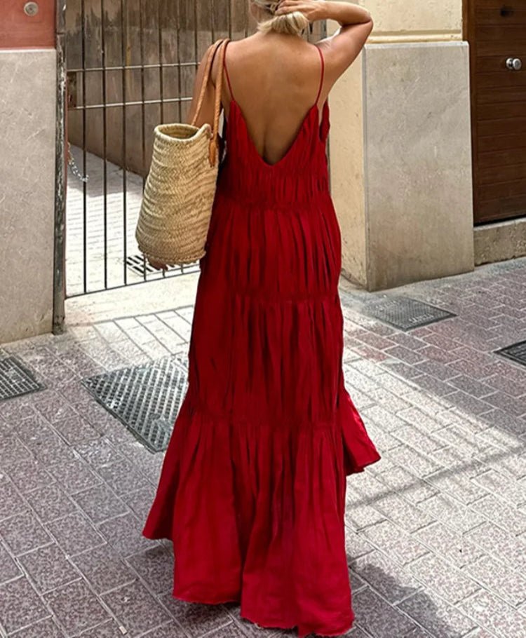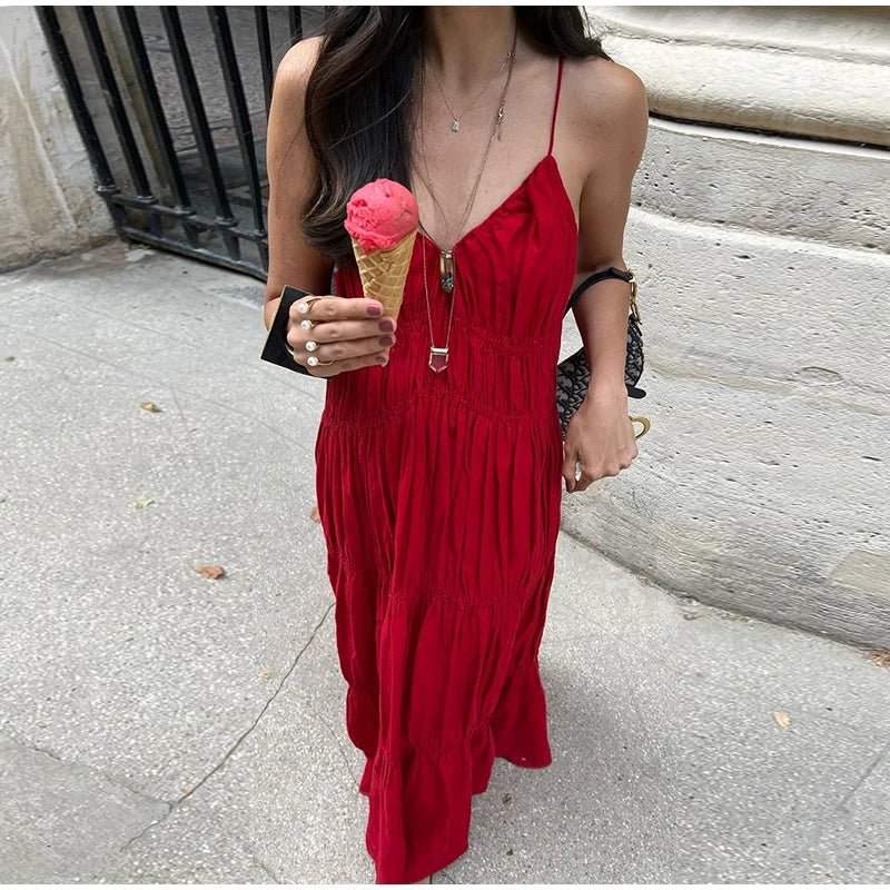 Design: A breezy ankle-length maxi dress featuring a ruffled design, elegant V-neckline, and delicate spaghetti straps. The open back and ruched detailing create a feminine, flowy silhouette perfect for seaside escapes.