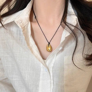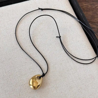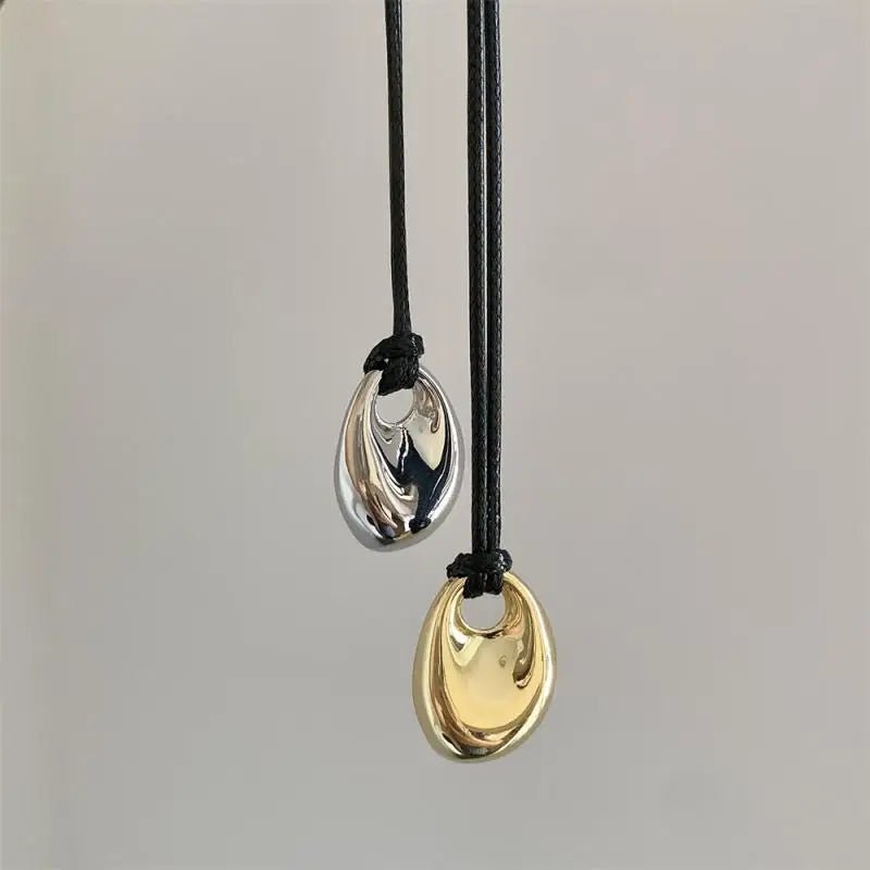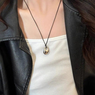 Design: A classic pendant necklace featuring a simple metal bean-shaped pendant with a geometric design, adding an understated elegance to any outfit.