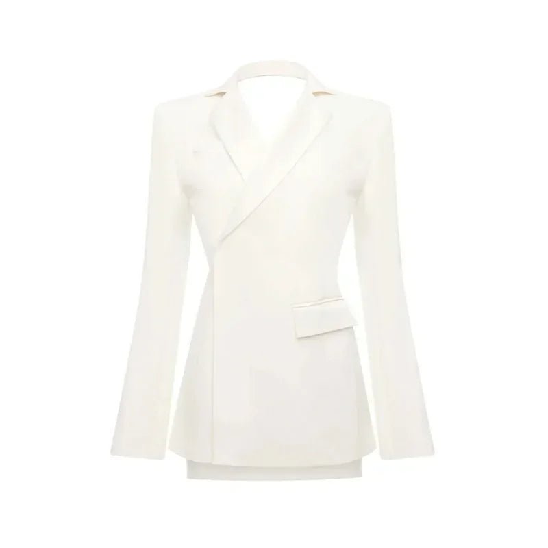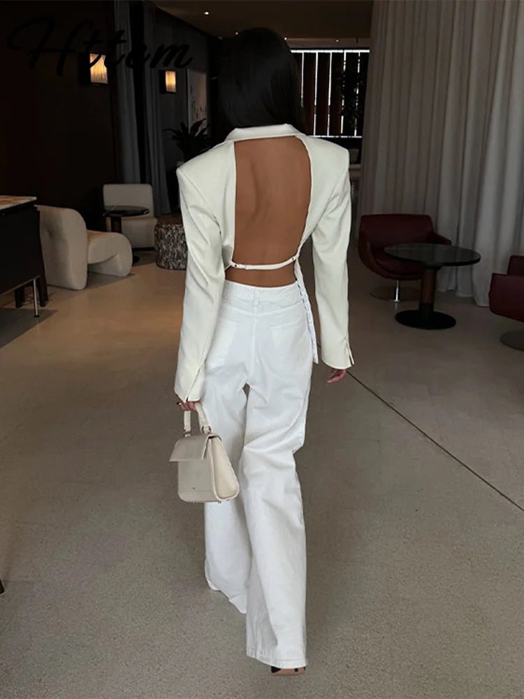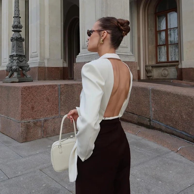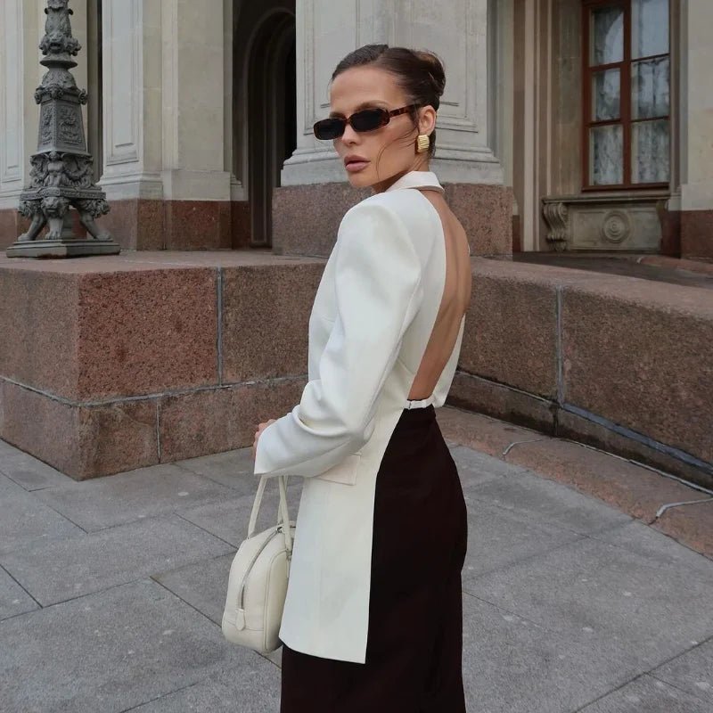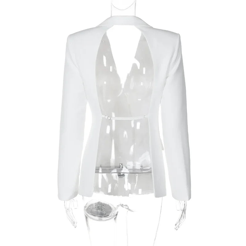 Design: A chic summer blazer featuring a daring backless design, covered button closure, and a classic turn‑down collar. Its slim fit and solid color create a sleek, polished look perfect for making a bold style statement.