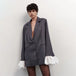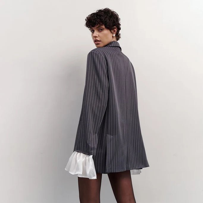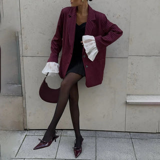 Design: A long striped blazer featuring a single-breasted closure, notched collar, and butterfly sleeves for a touch of elegance. The bright silk detailing adds a refined shimmer, making it a standout piece in any wardrobe.