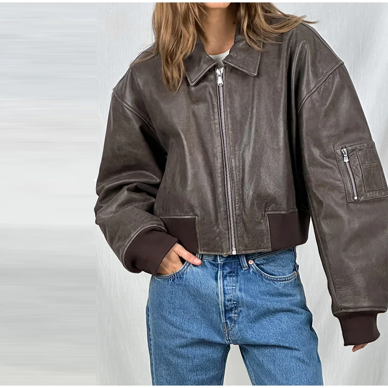 Design: This vintage-inspired leather bomber jacket combines high street style with classic appeal. Featuring a turn-down collar and button-up design, it offers a versatile look suitable for both casual and semi-formal occasions. The full-length sleeves and practical pockets enhance its functionality, while the zipper closure adds a sleek finish.