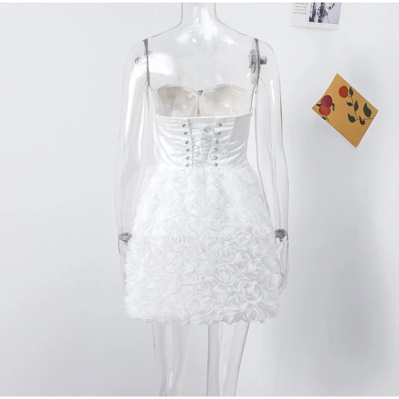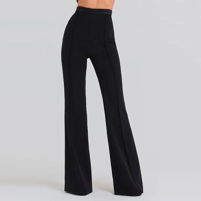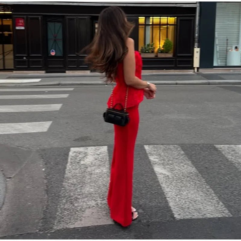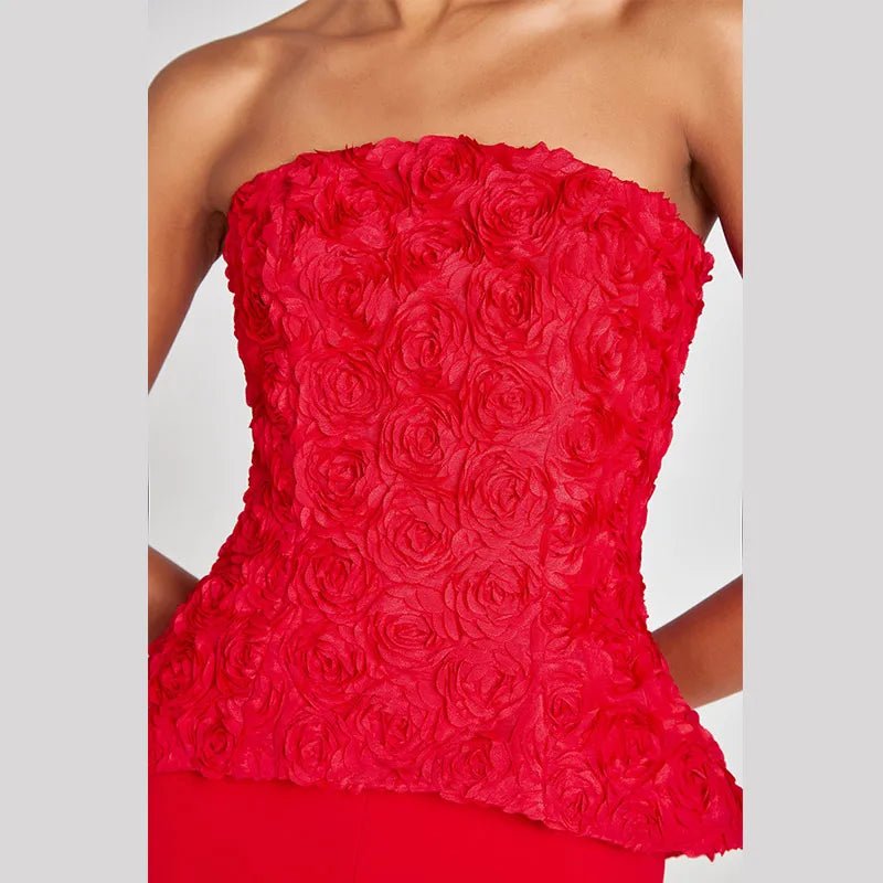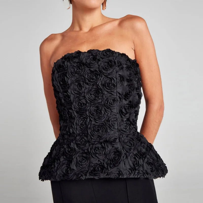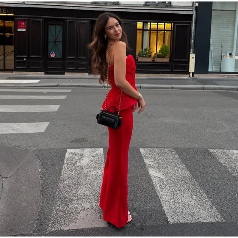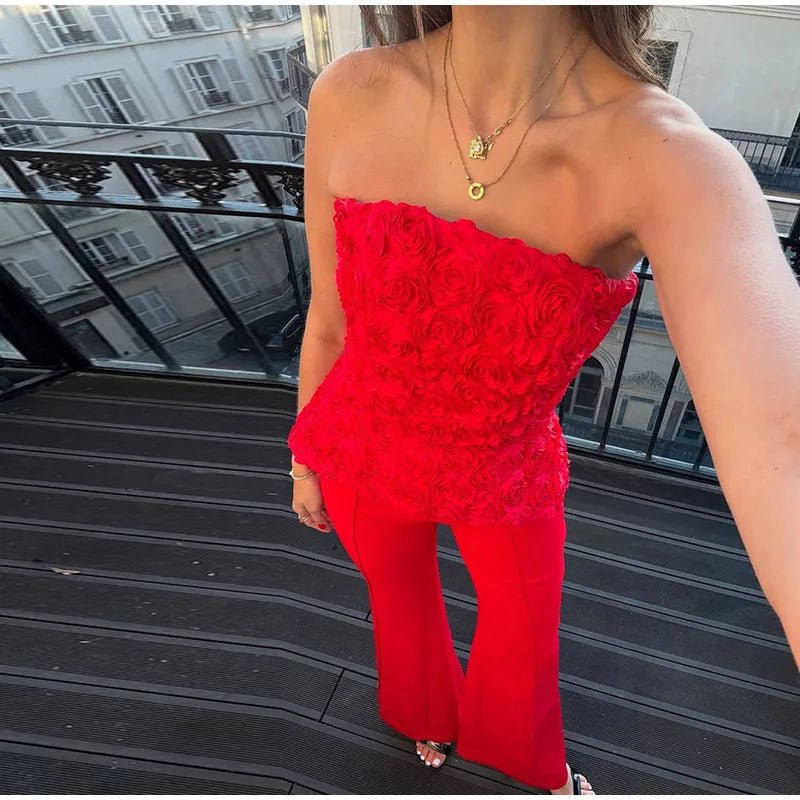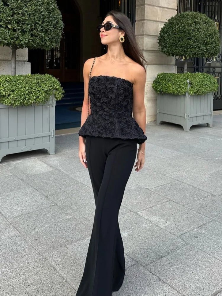 Design: A stylish two-piece outfit featuring a strapless tube top with 3D floral decoration and matching straight-leg full-length pants. Finished with a flattering high waist and elastic waistband.
