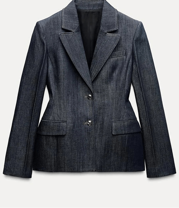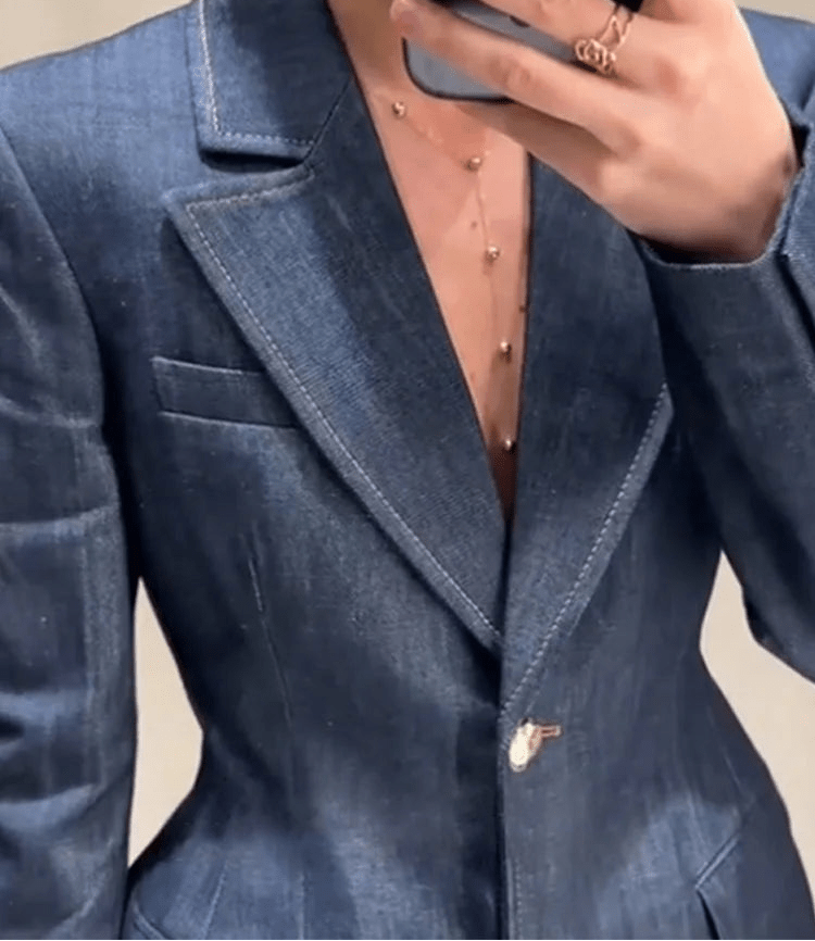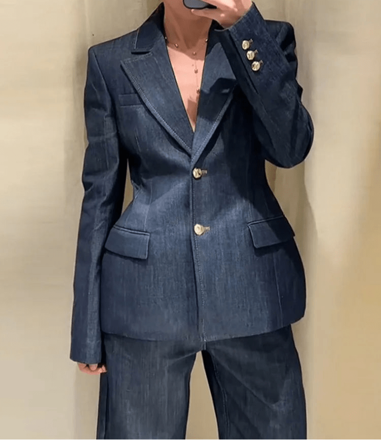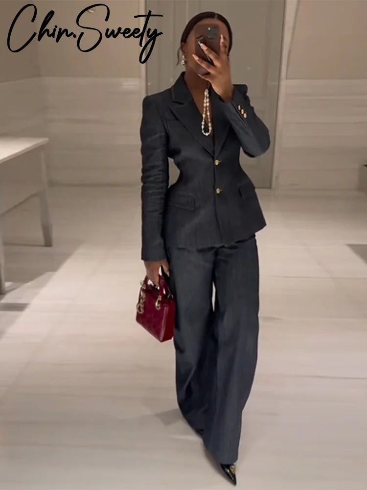 Design: Elegant 3-piece denim pant set featuring a turn-down collar shirt with button and pocket details, paired with wide-leg pants and a matching layer for a polished look.
