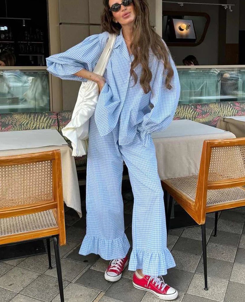 Design: A plaid shirt with a turn-down collar, flare sleeves, and single-breasted closure paired with wide-leg, high-waisted pants for a relaxed streetwear look.