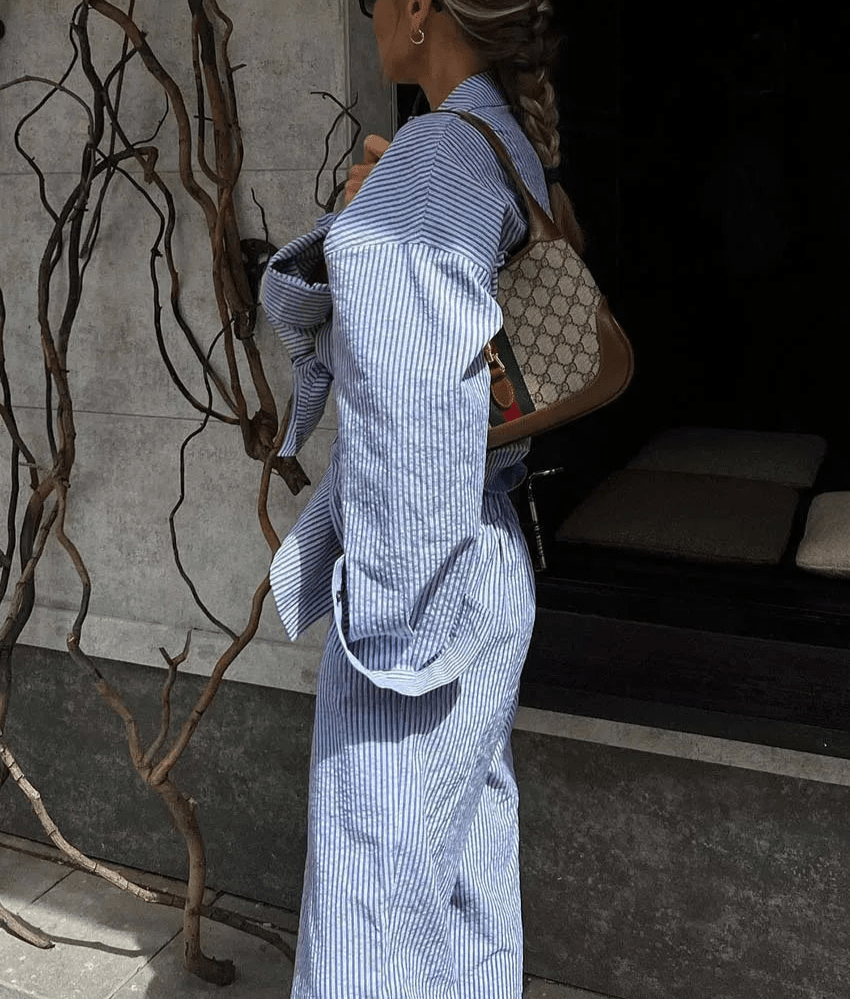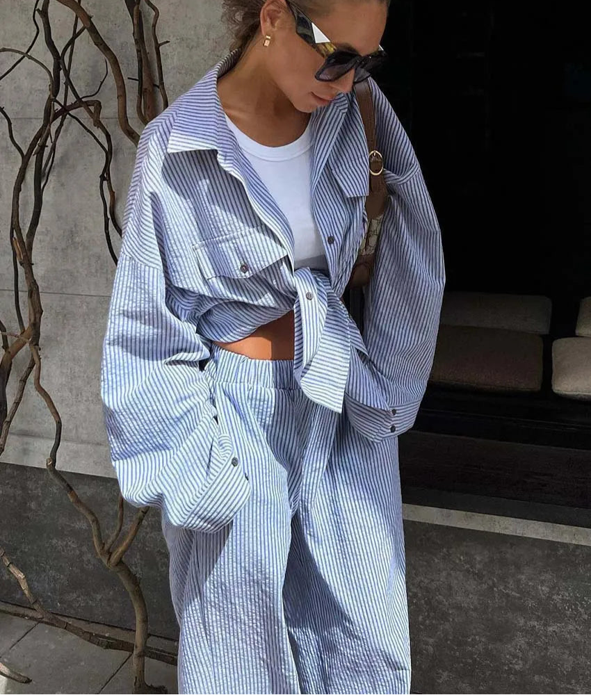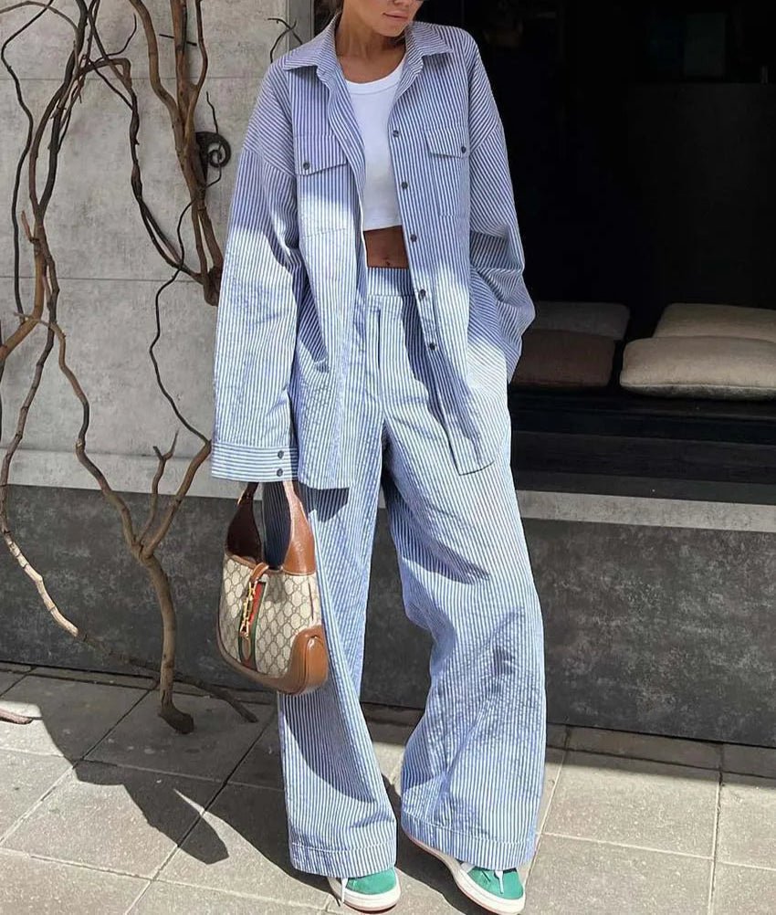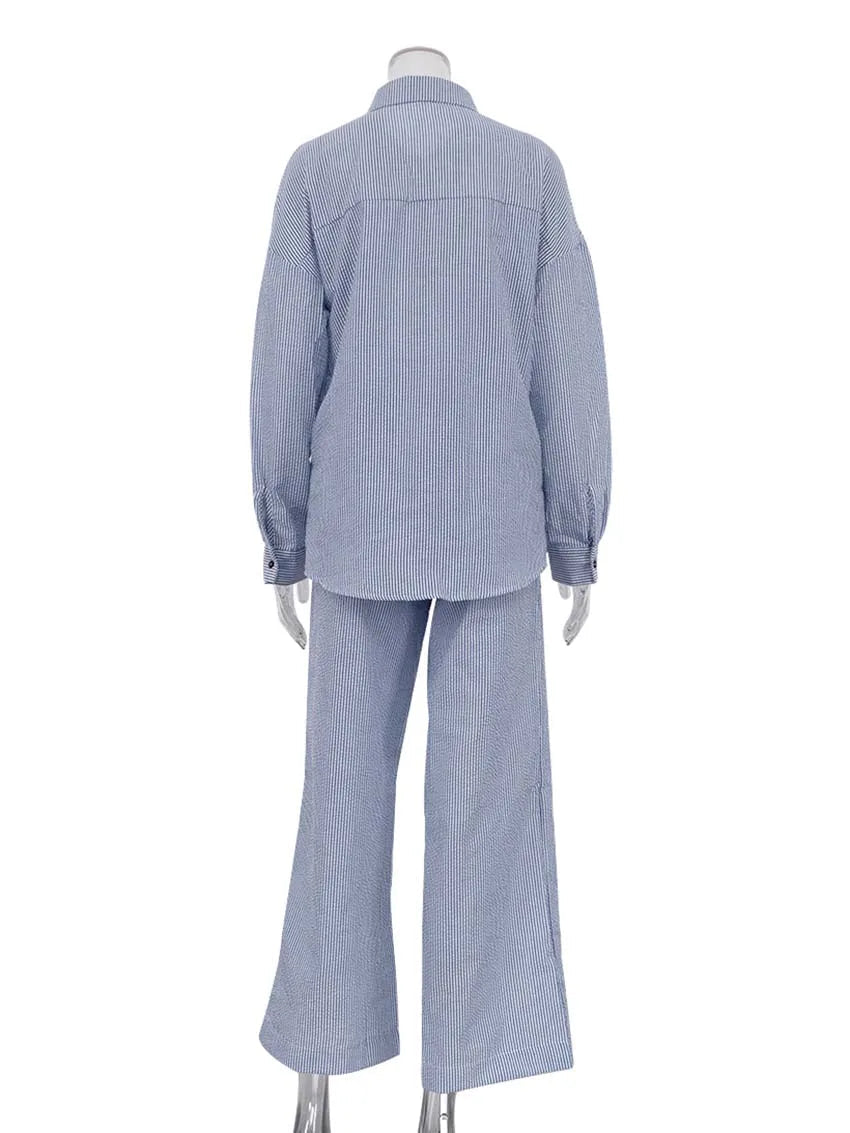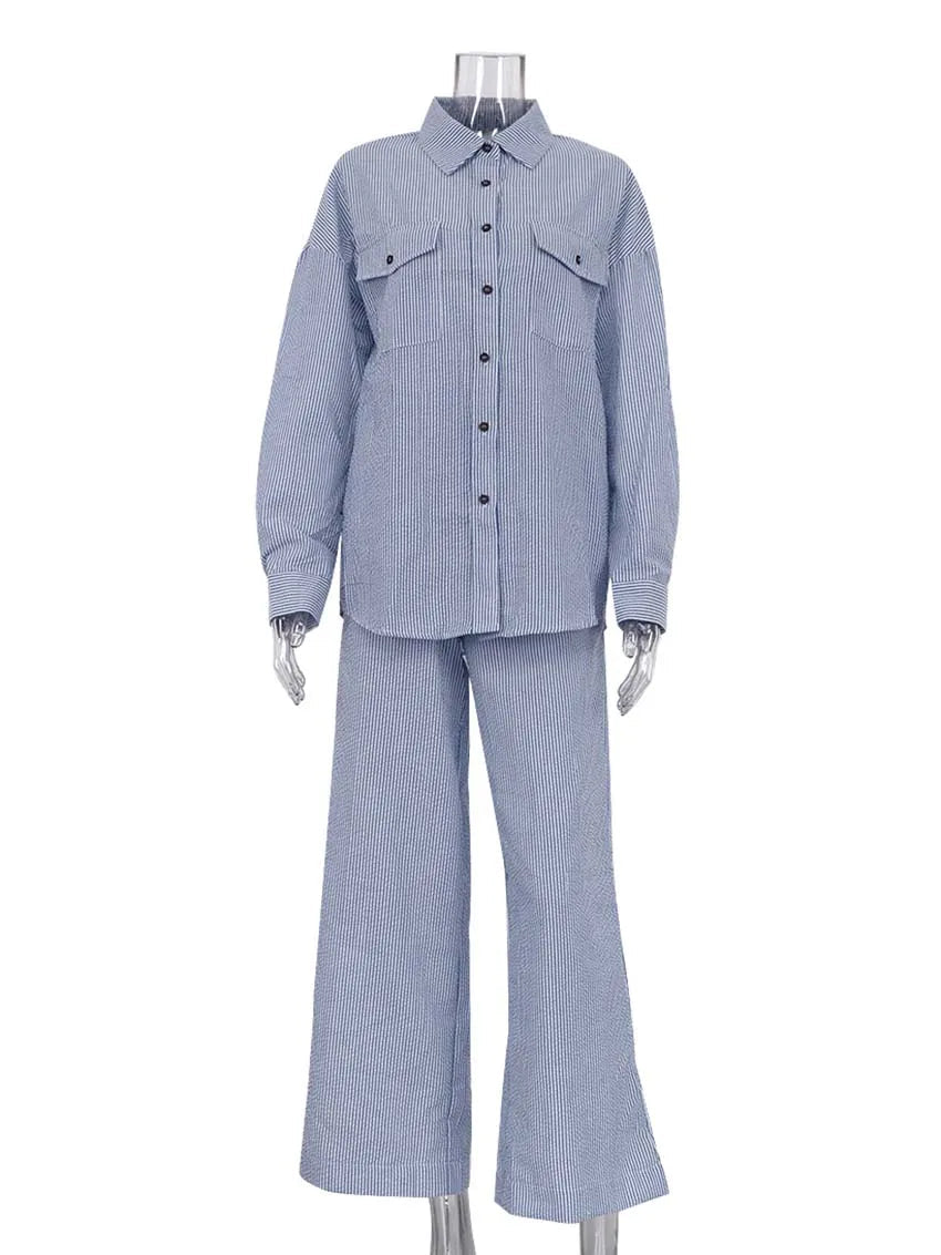 Design: A stylish two-piece set featuring a long sleeve button-down shirt with a turn-down collar and a relaxed low-waist straight-leg trouser. The printed pattern adds a modern touch to the classic silhouette, offering effortless elegance.