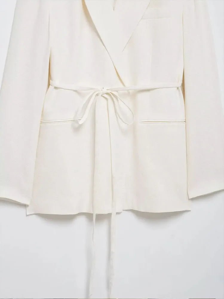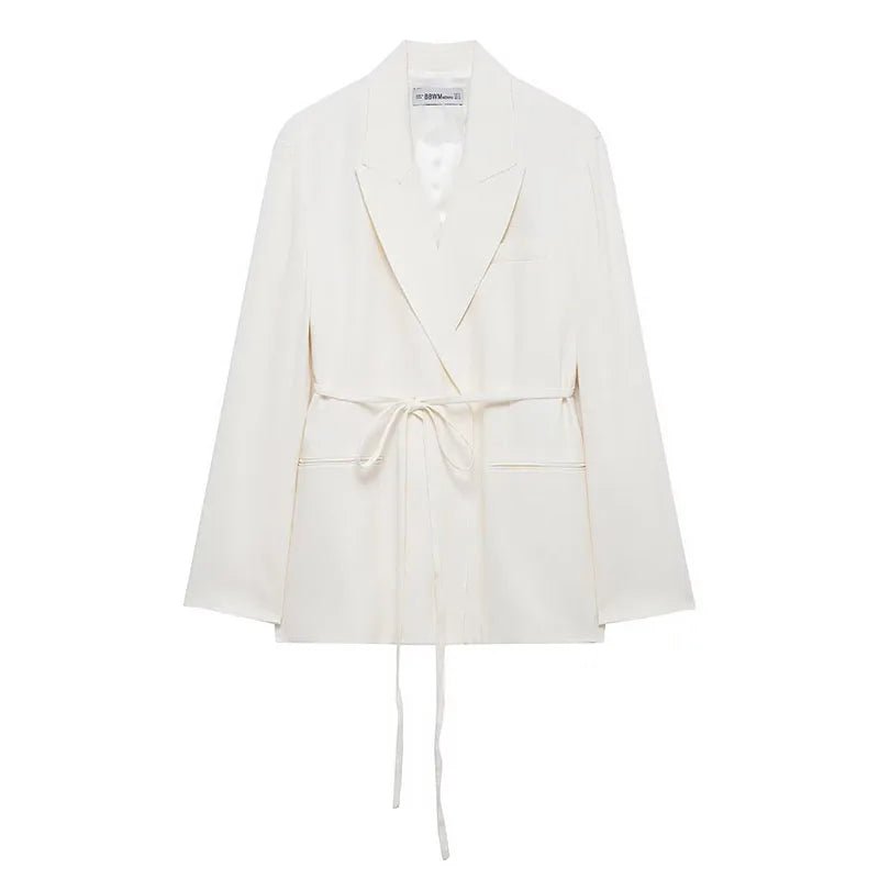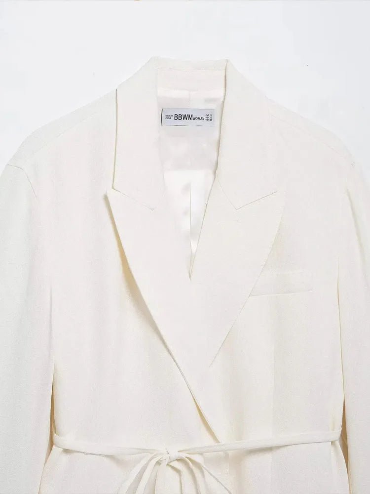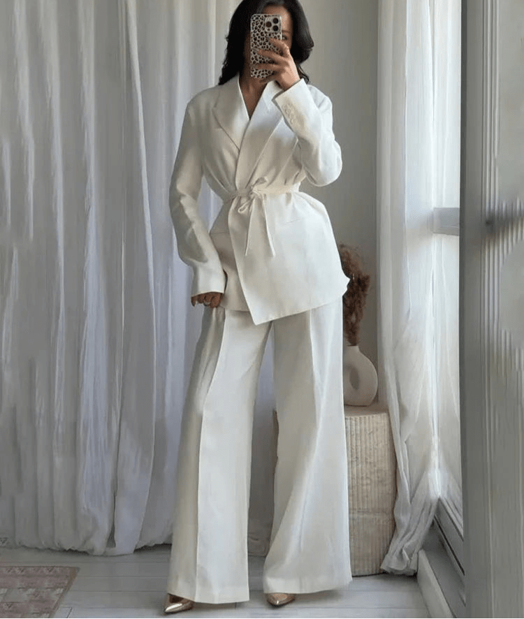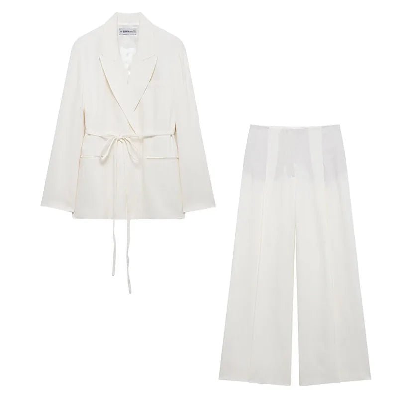 Design: This stylish pant suit features a classic pleated front and a sophisticated long-sleeve top with a turn-down collar. The set is accented by sashes at the waist for added elegance, complemented by wide-leg pants that create a chic office-ready look.