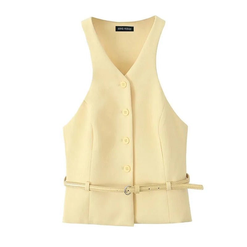 Design: Chic summer two-piece set featuring a V-neck sleeveless top with a single-breasted front and coordinating belt, paired with a high-waisted ankle-length skirt with pockets and sash detailing.