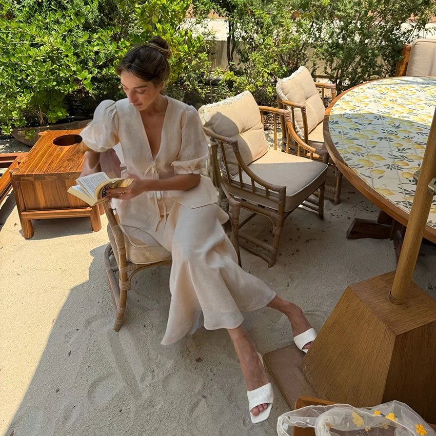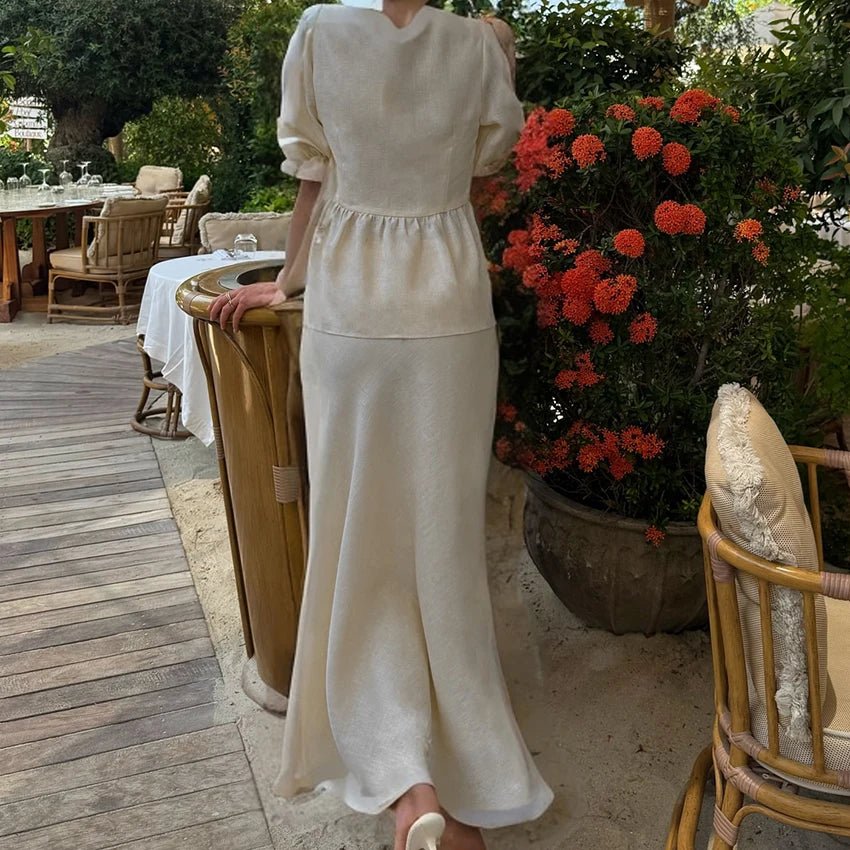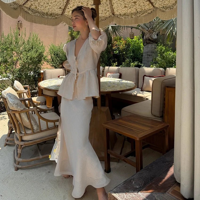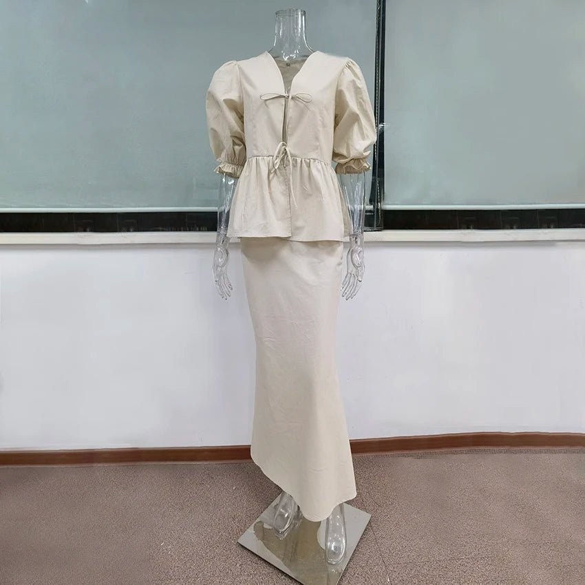 Design: A chic two‑piece outfit featuring a V‑neck puff sleeve top with fold details and an ankle‑length A‑line skirt. The solid color and airy cotton fabric create a relaxed yet elegant look for any season.