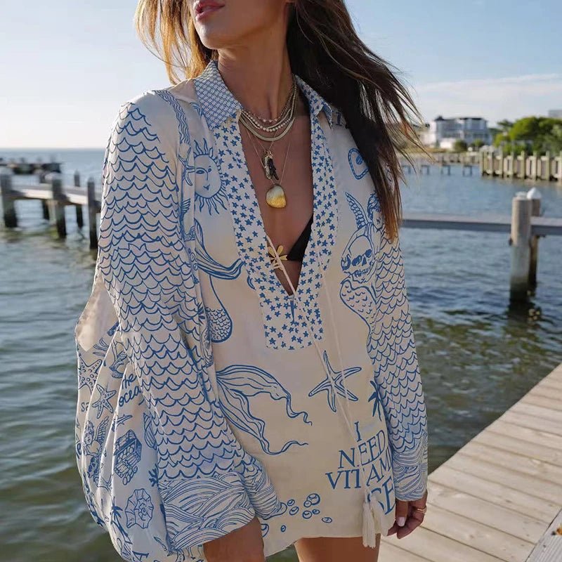 Design: A chic V-neck satin vacation shirt paired with comfortable print shorts. The pullover top features hollow-out detailing, while the relaxed fit and full sleeves add a breezy, effortless vibe. The elastic waist shorts complete the laid-back, stylish look.