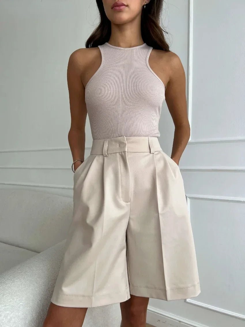 Design: Timeless high-waist shorts featuring a relaxed, loose fit with practical side pockets and a clean button-fly closure. The herringbone texture adds a touch of sophistication to the minimalist design.