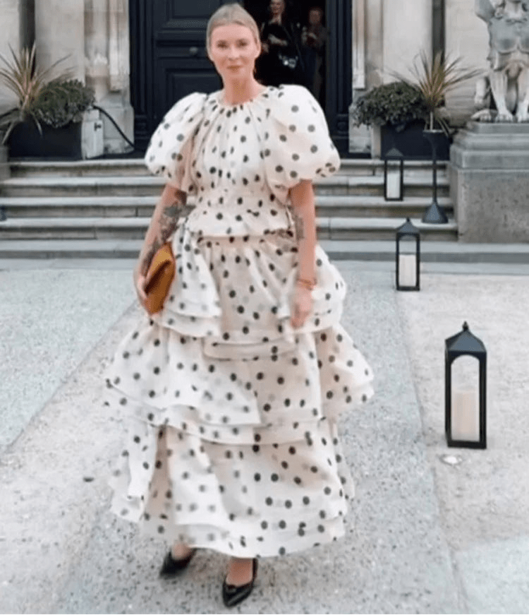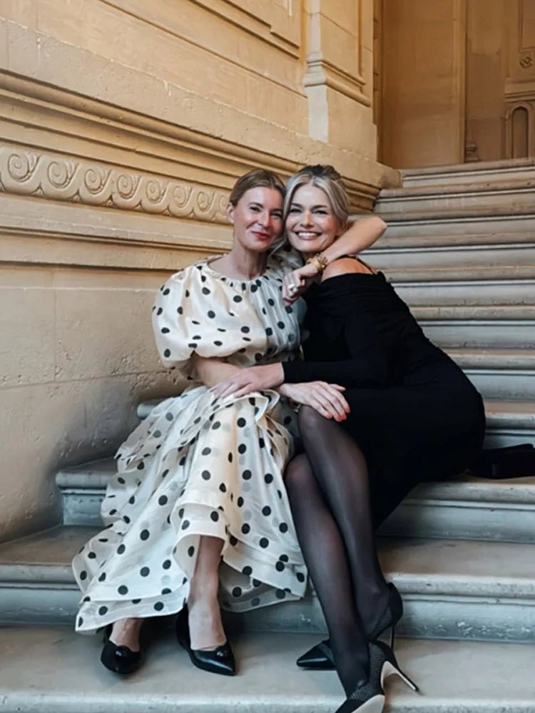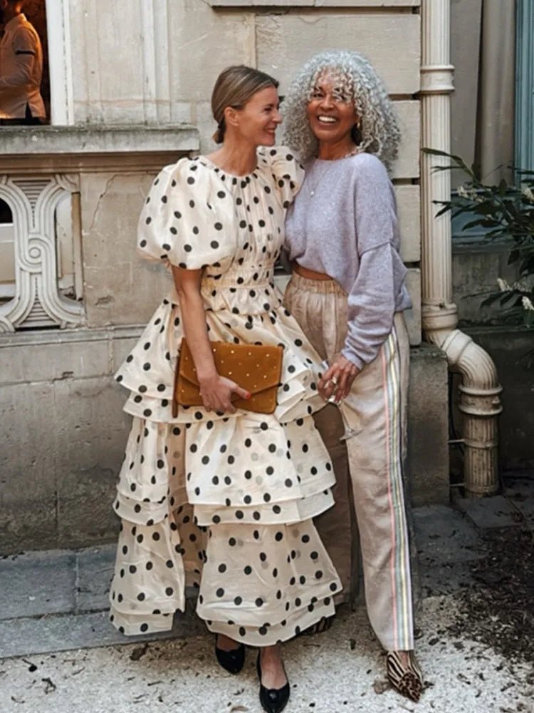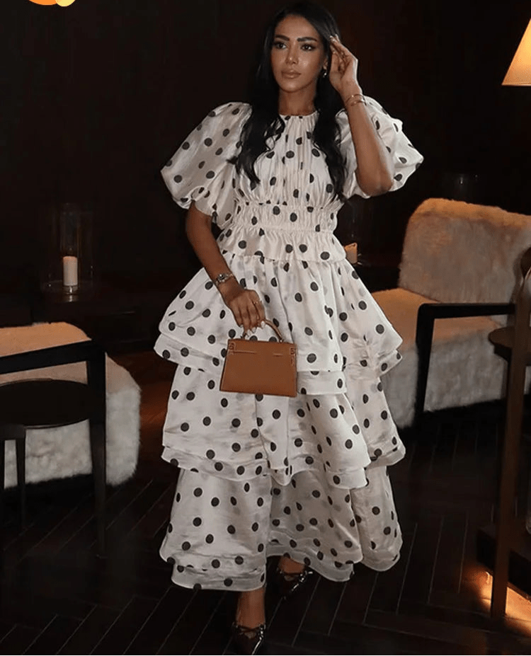 Design: A chic two-piece set featuring a round neck top with puffy short sleeves and a mid-calf ruffled skirt. The polka dot print and layered folds create an elegant, playful silhouette perfect for spring and summer.