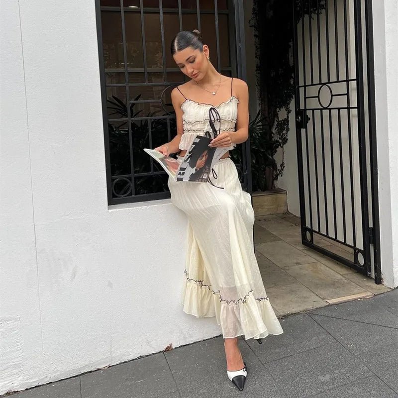 Design: A chic two-piece summer set featuring a slim-fit spaghetti strap crop top with lace-up detailing and a matching floor-length A-line skirt. The slash neckline and patchwork accents bring a flirty, French-inspired beach vibe.