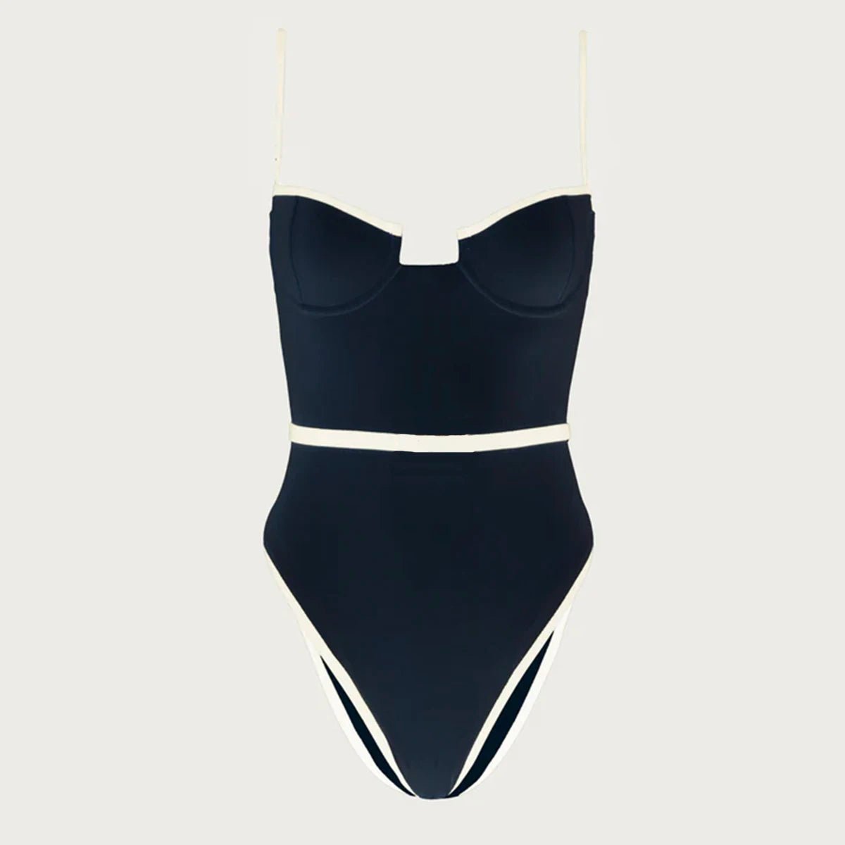 Design: A chic one-piece swimsuit featuring a high-waist silhouette, bandeau-style top, and adjustable straps. The patchwork pattern adds a modern, flattering touch.
