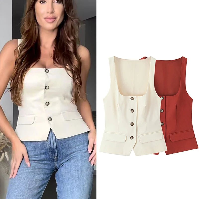 Design: A sleek sleeveless top featuring a single-breasted front with button detailing. The clean lines and minimalist silhouette make it a versatile staple for effortless warm-weather styling.