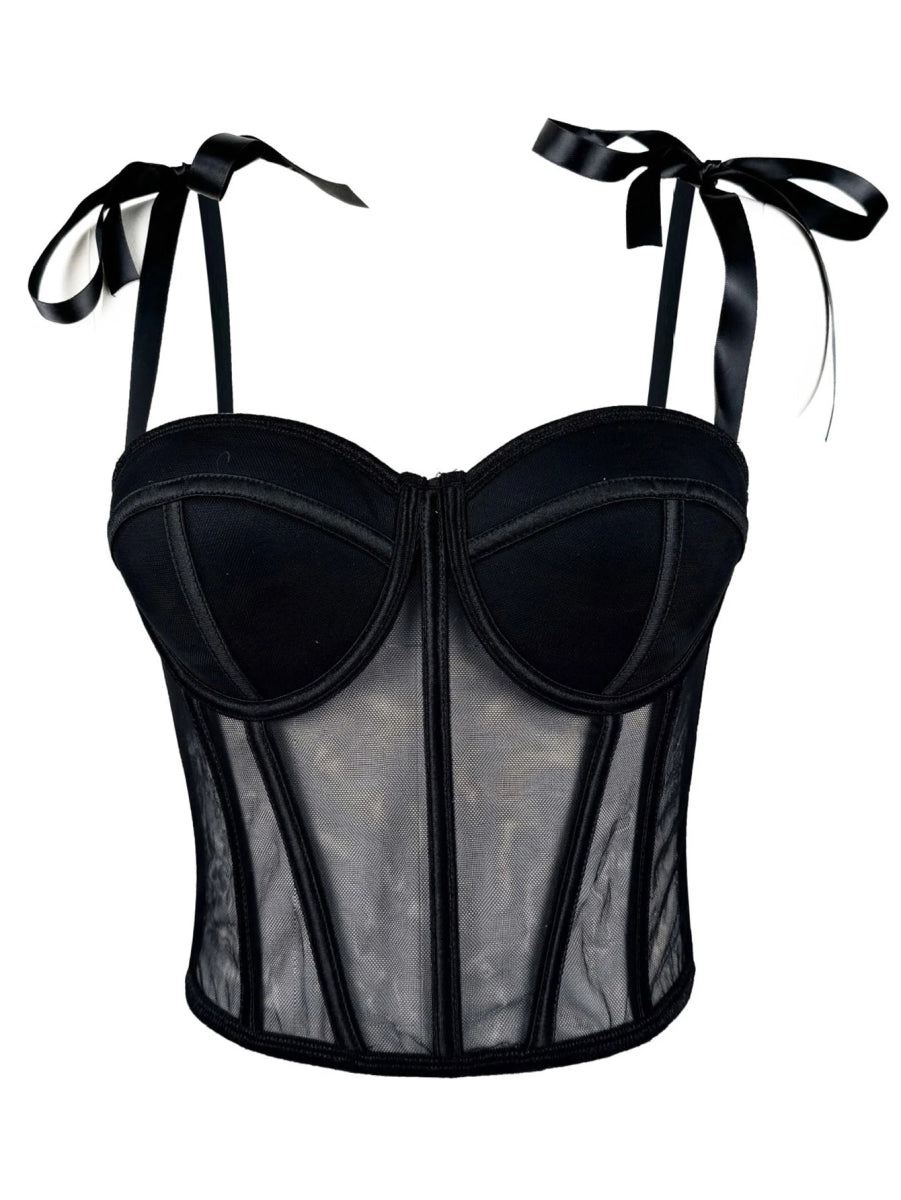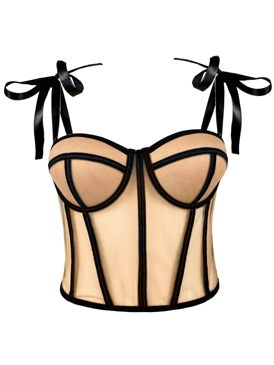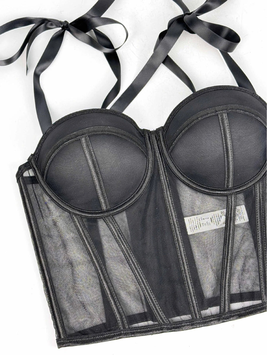 Design: A sexy mesh corset-inspired crop top featuring a halter neckline and striking backless design. The form-fitting silhouette and sheer details make it a bold statement piece for summer nights.