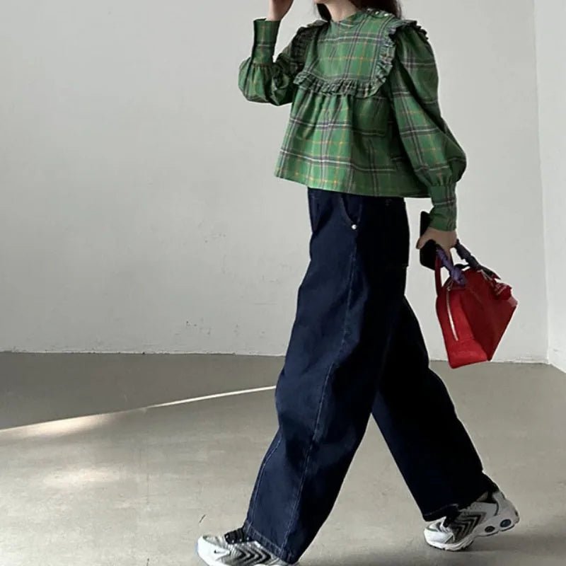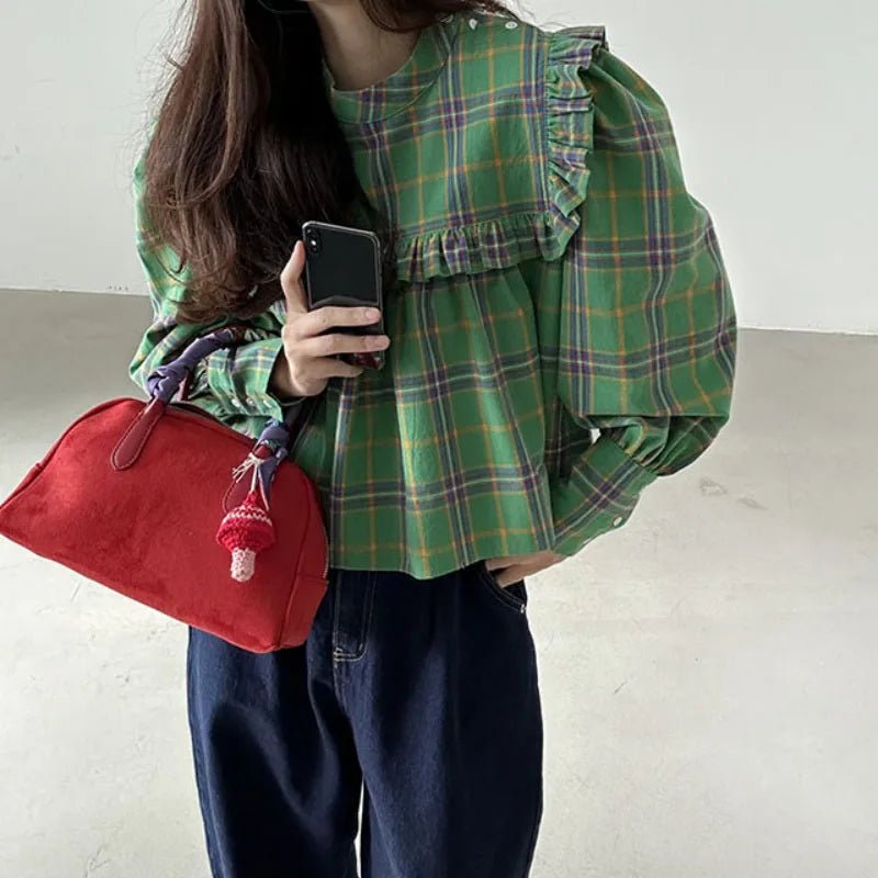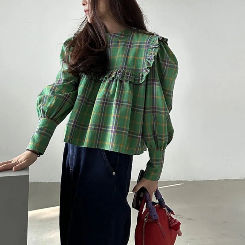 Design: A charming plaid blouse featuring puff sleeves, ruffle decoration, a Peter Pan collar, and a loose, casual silhouette. The pullover style and playful details make it perfect for effortless spring and summer looks.