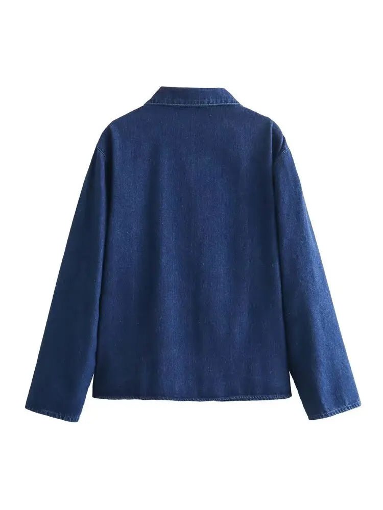 Design: A trendy solid-color denim blouse with a turn-down collar, lace-up detailing, and functional pockets. Designed for a casual, laid-back spring/summer look.