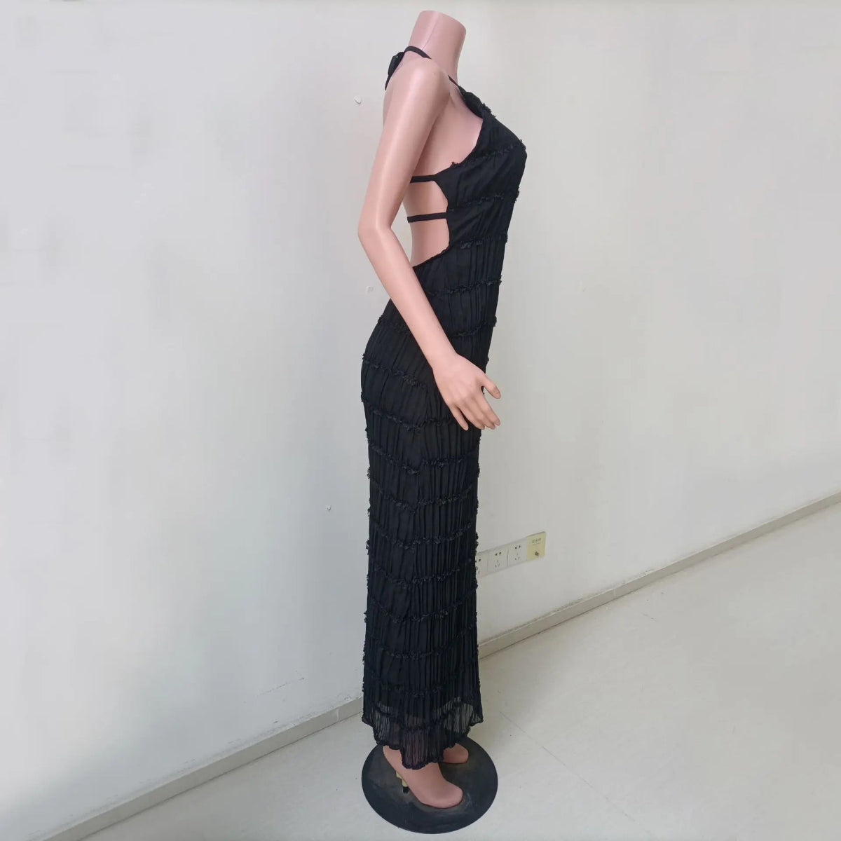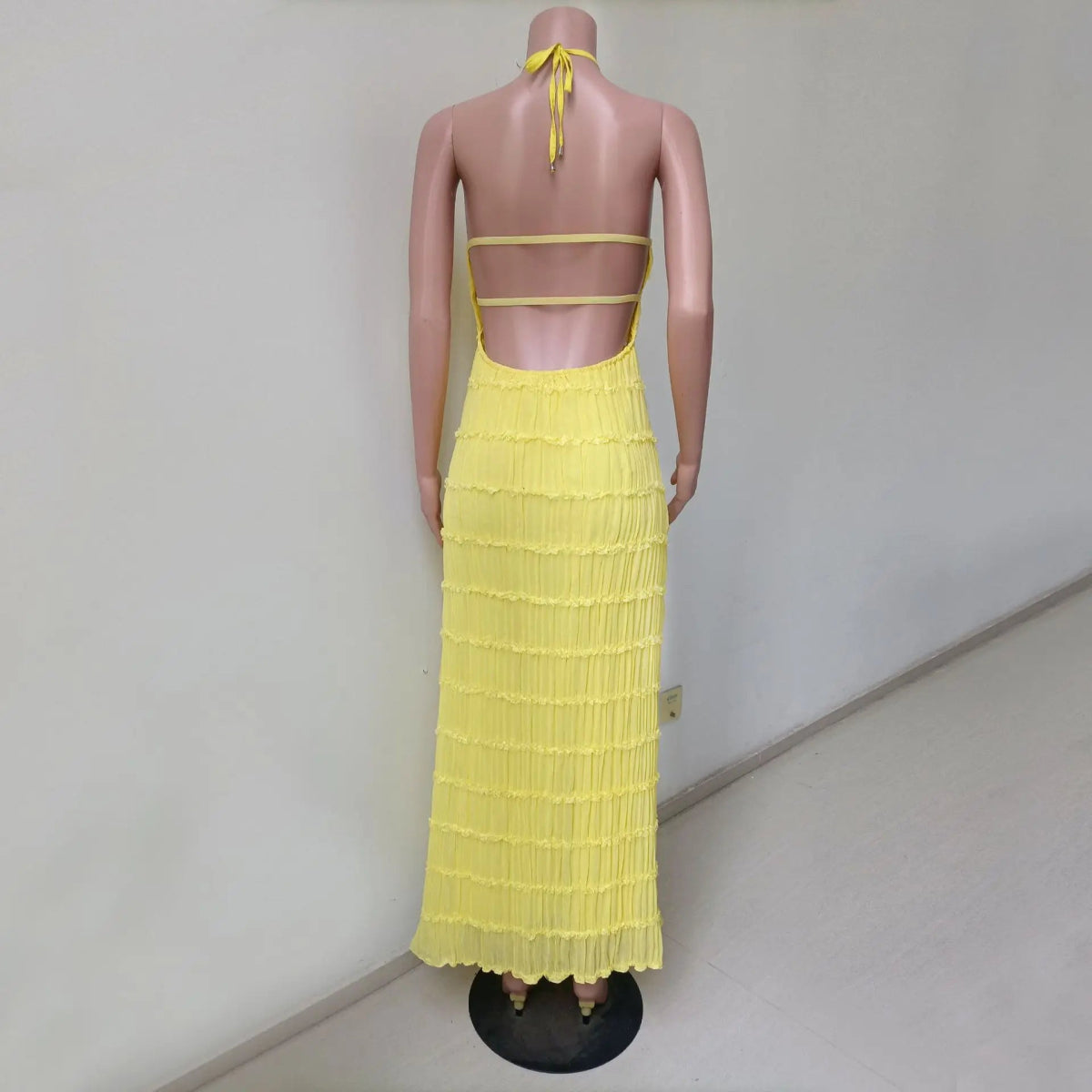 Design: A breezy floor-length beach dress with a backless design, high waist, and sleeveless silhouette for a relaxed yet alluring summer look.
