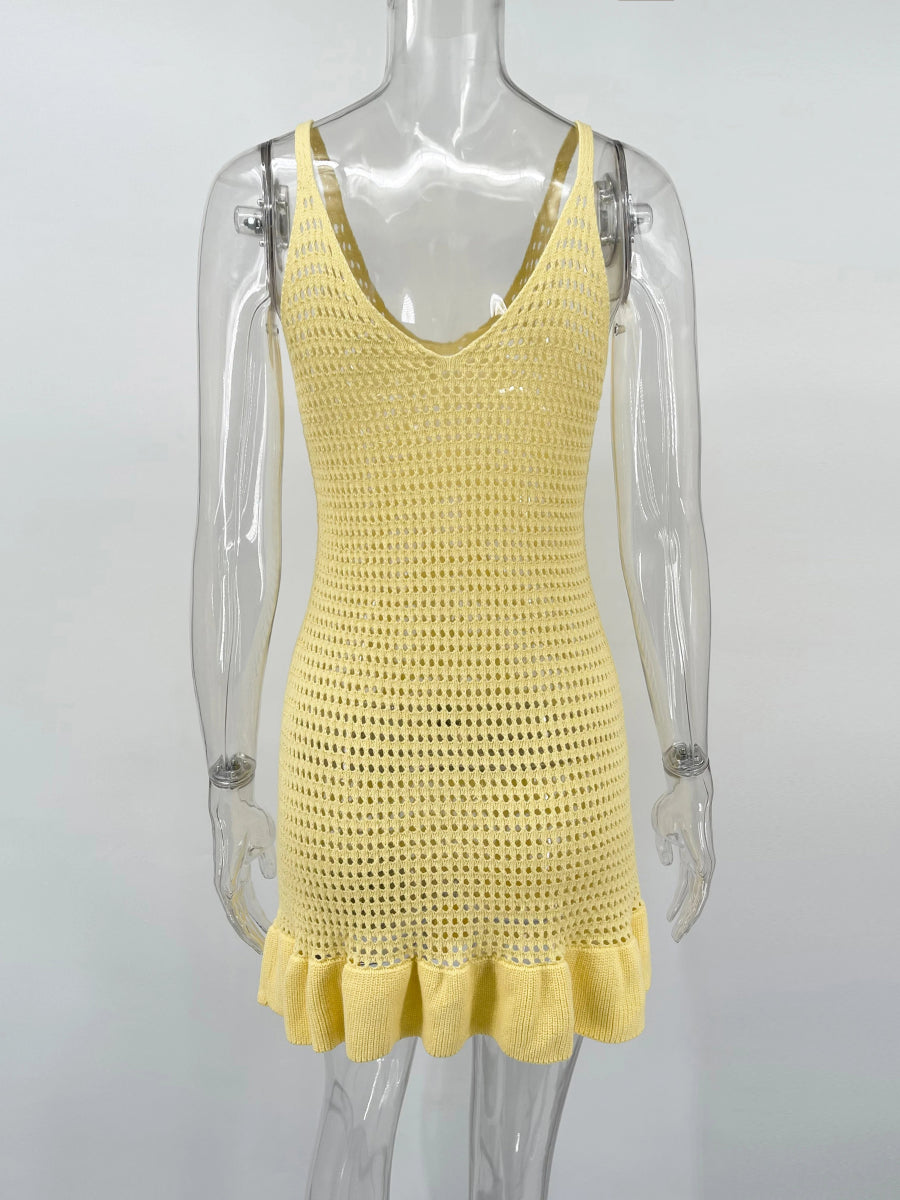 Design: A breezy beach-ready knit dress featuring a V-neckline, spaghetti straps, and delicate hollow-out detailing. Its knee-length straight silhouette offers effortless style for sun-soaked days.