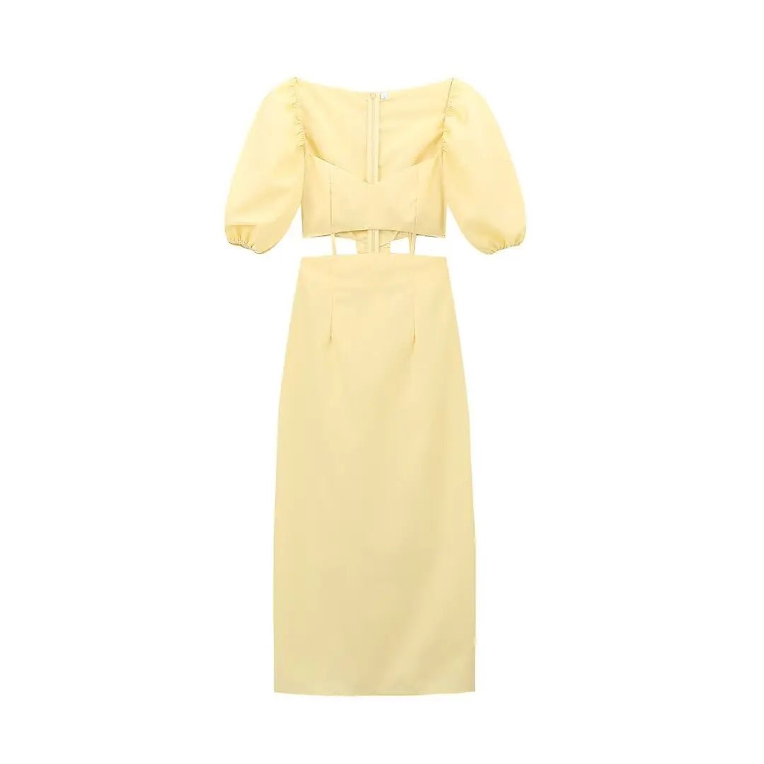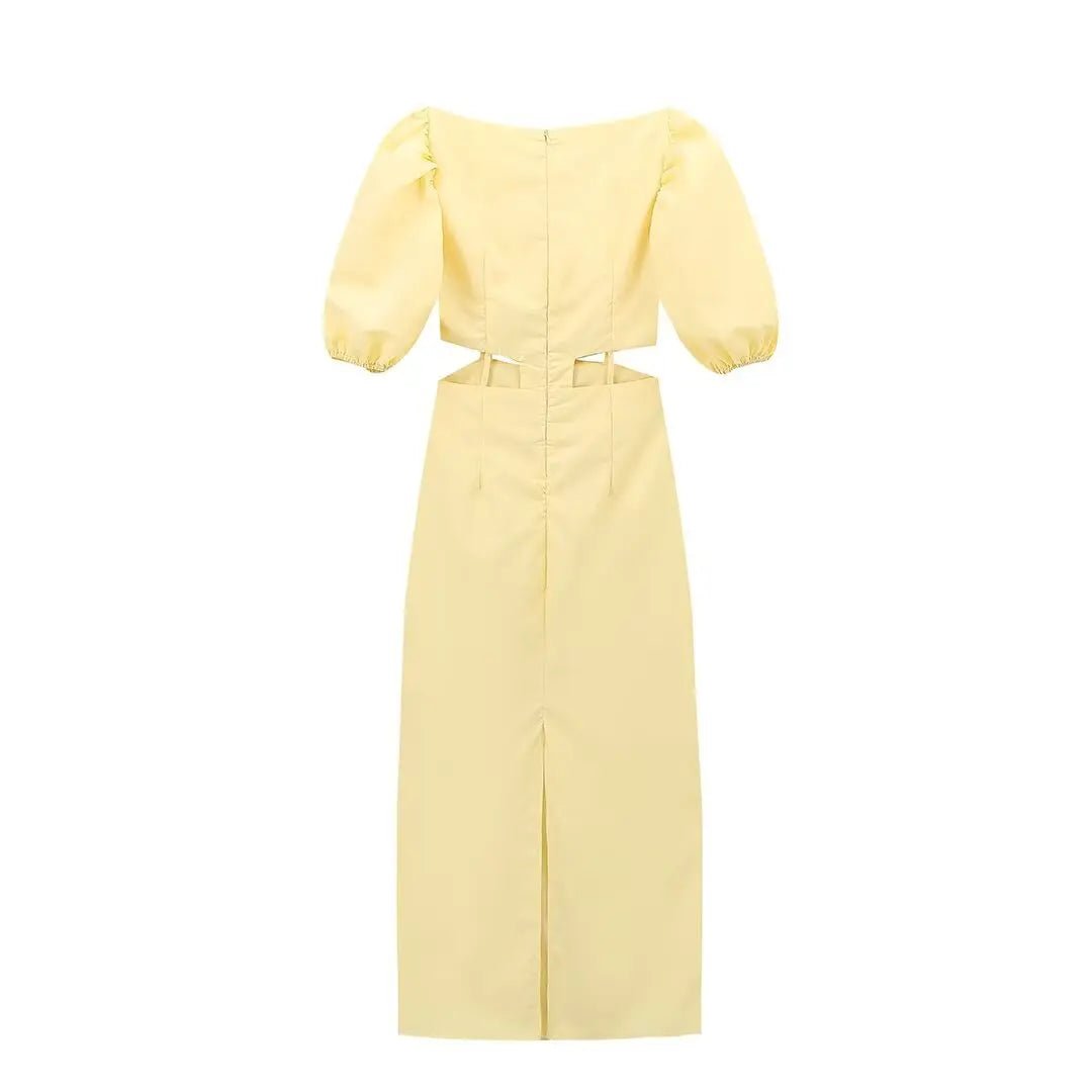 Design: A vintage ankle-length dress featuring a hollow-out waist, straight silhouette, and short regular sleeves for a chic high street look.
