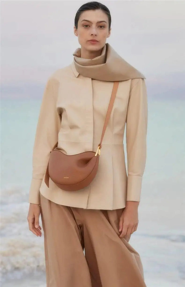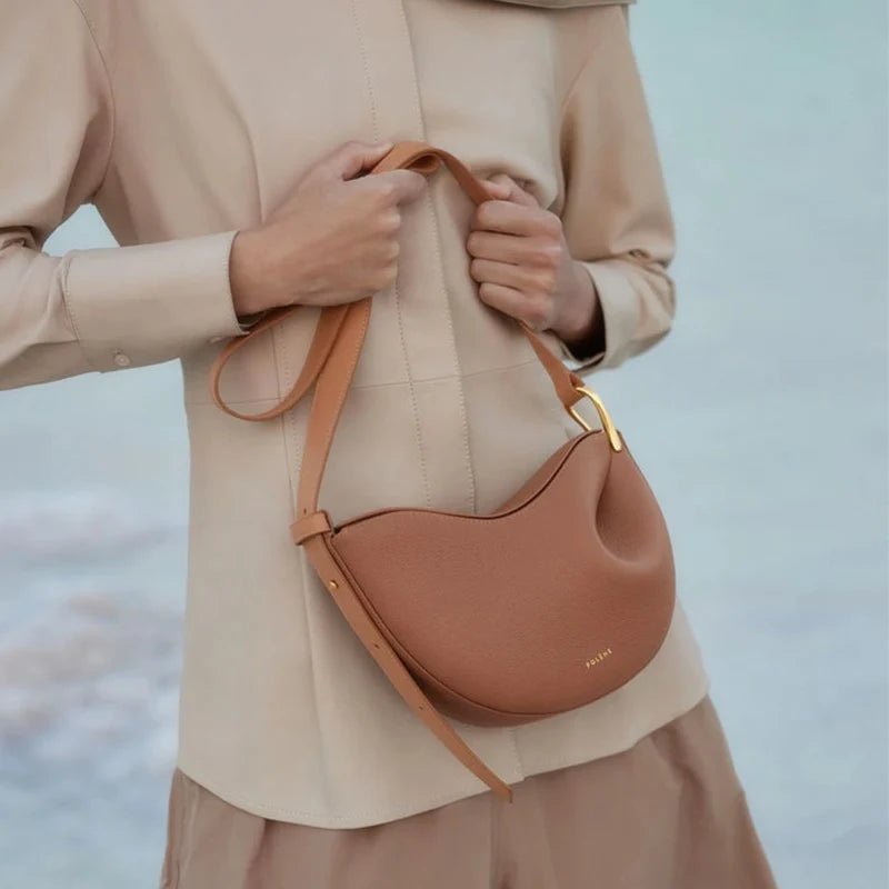 Design: A minimalist saddle-style bucket bag crafted from real leather. Features a sleek one-shoulder crossbody design with a pea bag silhouette.