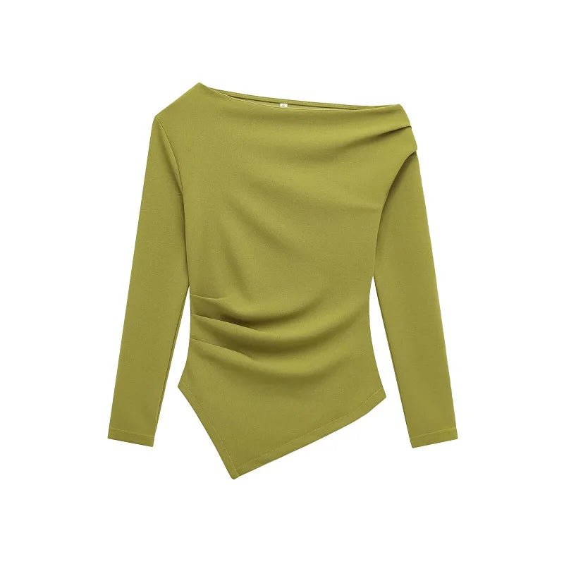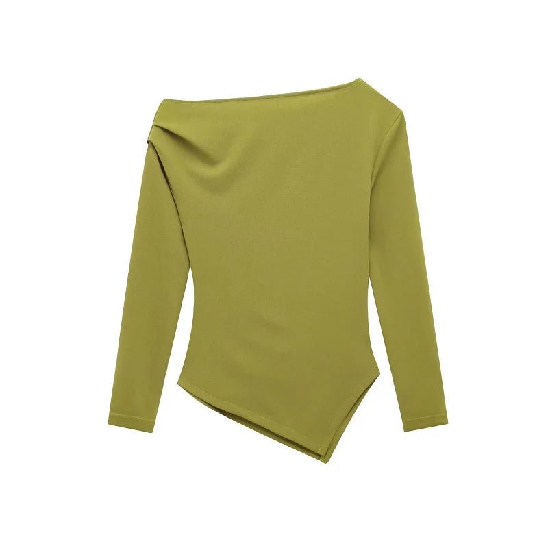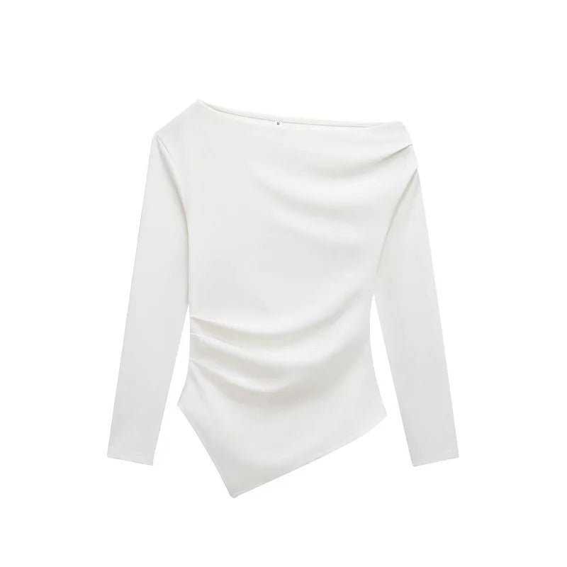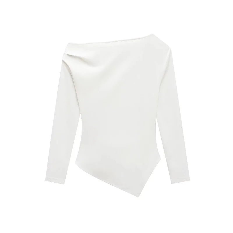Design: A sleek off-shoulder top featuring a slim-fit silhouette, subtle fold details, and a clean pullover design. The O-neckline and open stitch style add a touch of edge to this modern high-street essential.