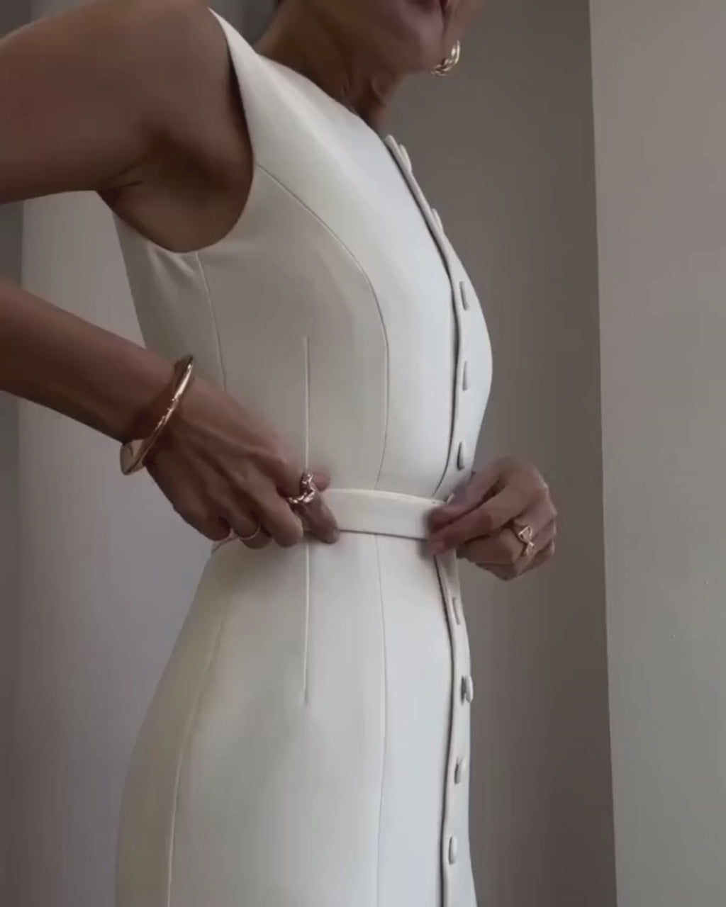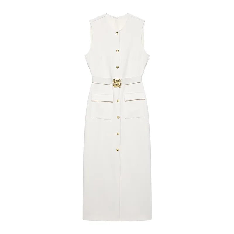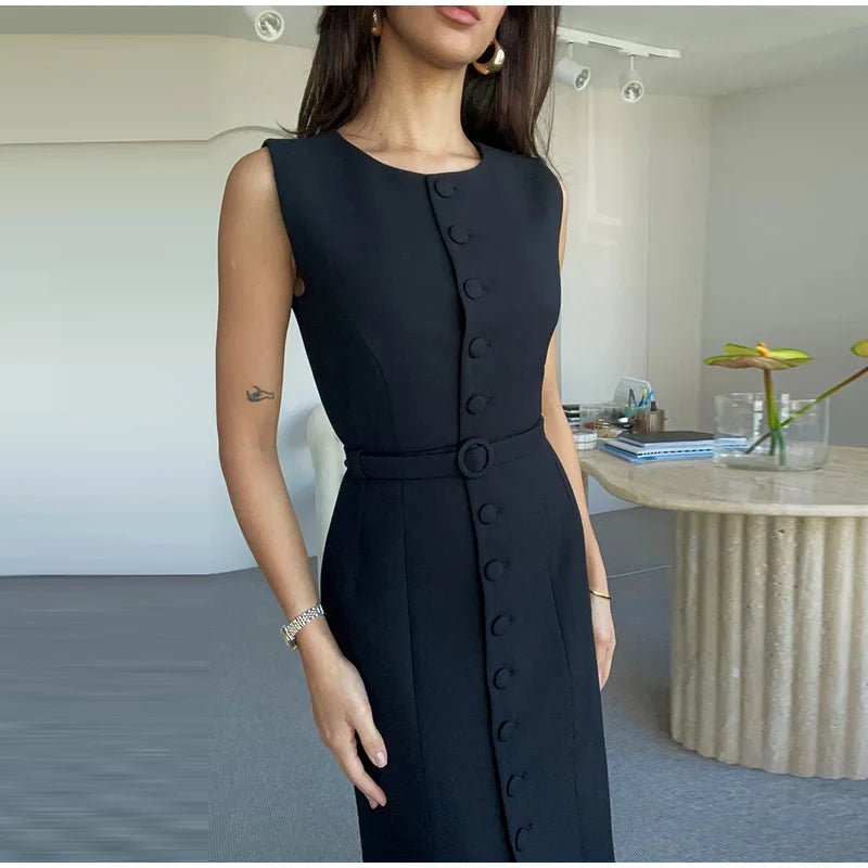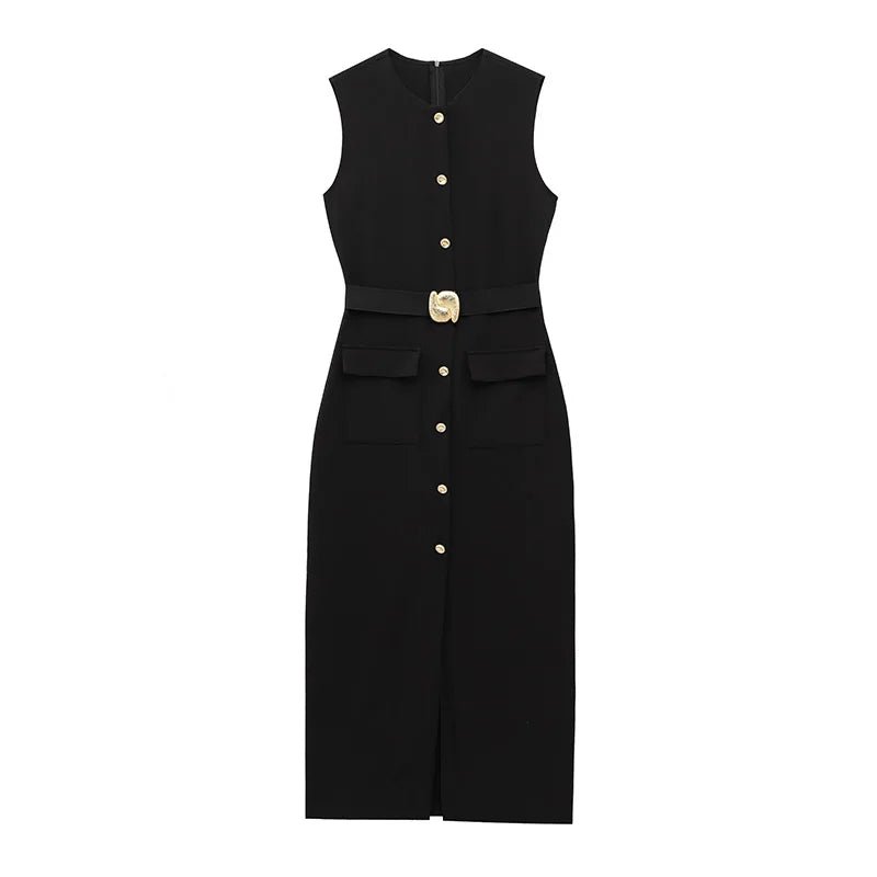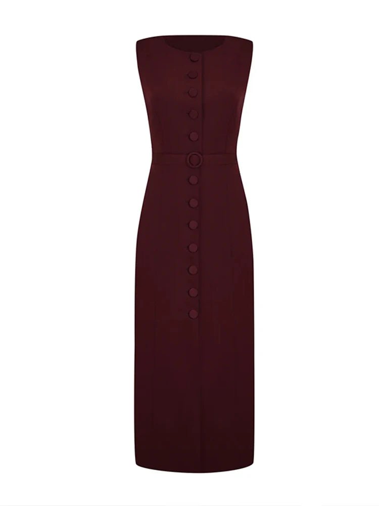 Design: Chic single-breasted dress with an O-neckline, sleeveless cut, and matching belt for a cinched empire waist. Button details add a touch of sophistication.