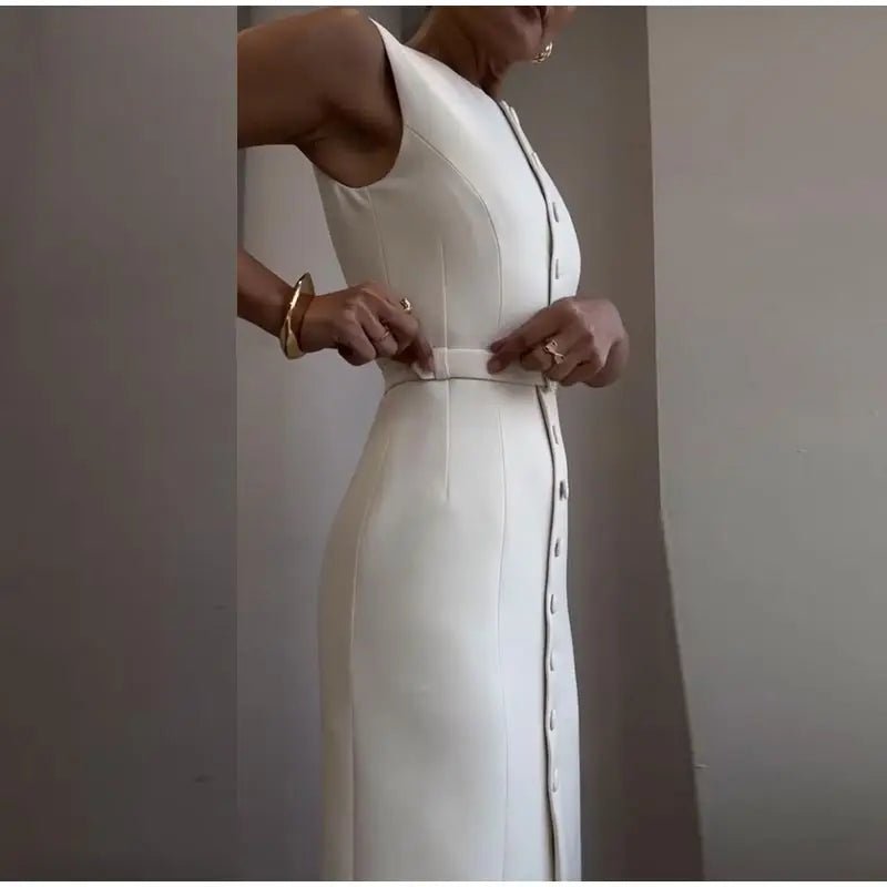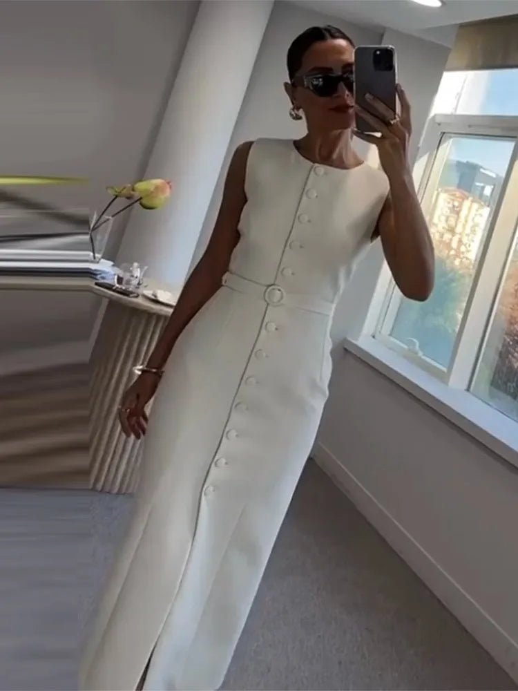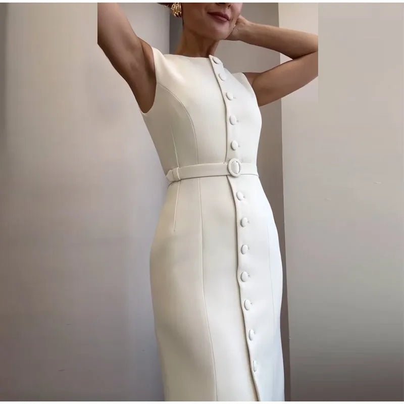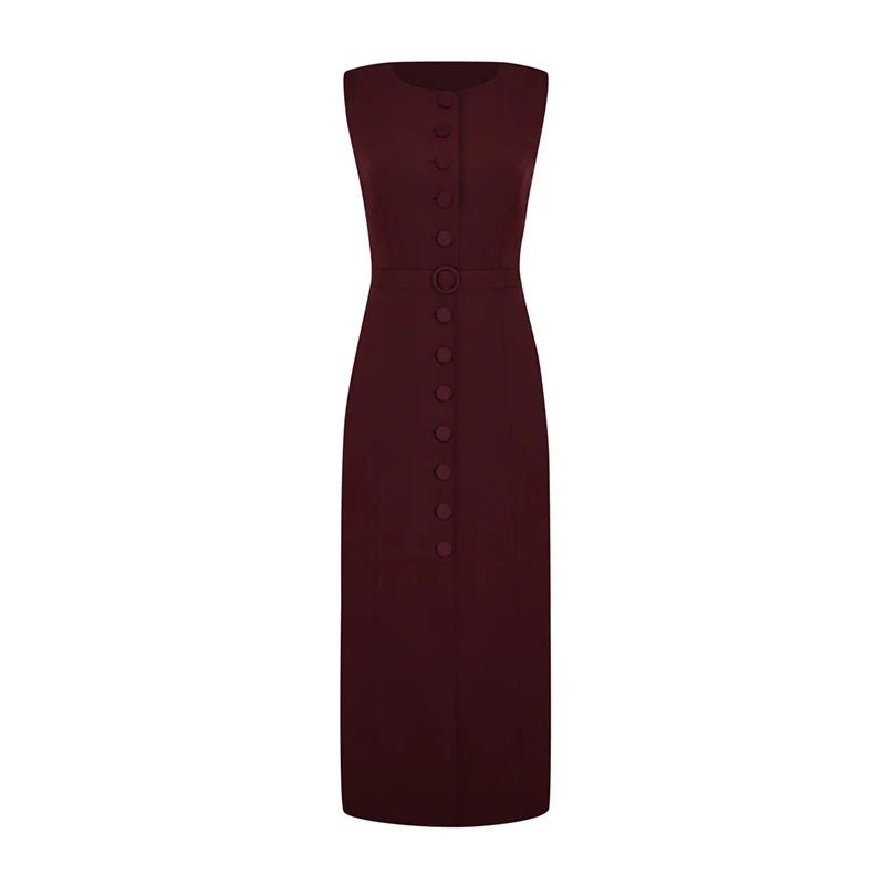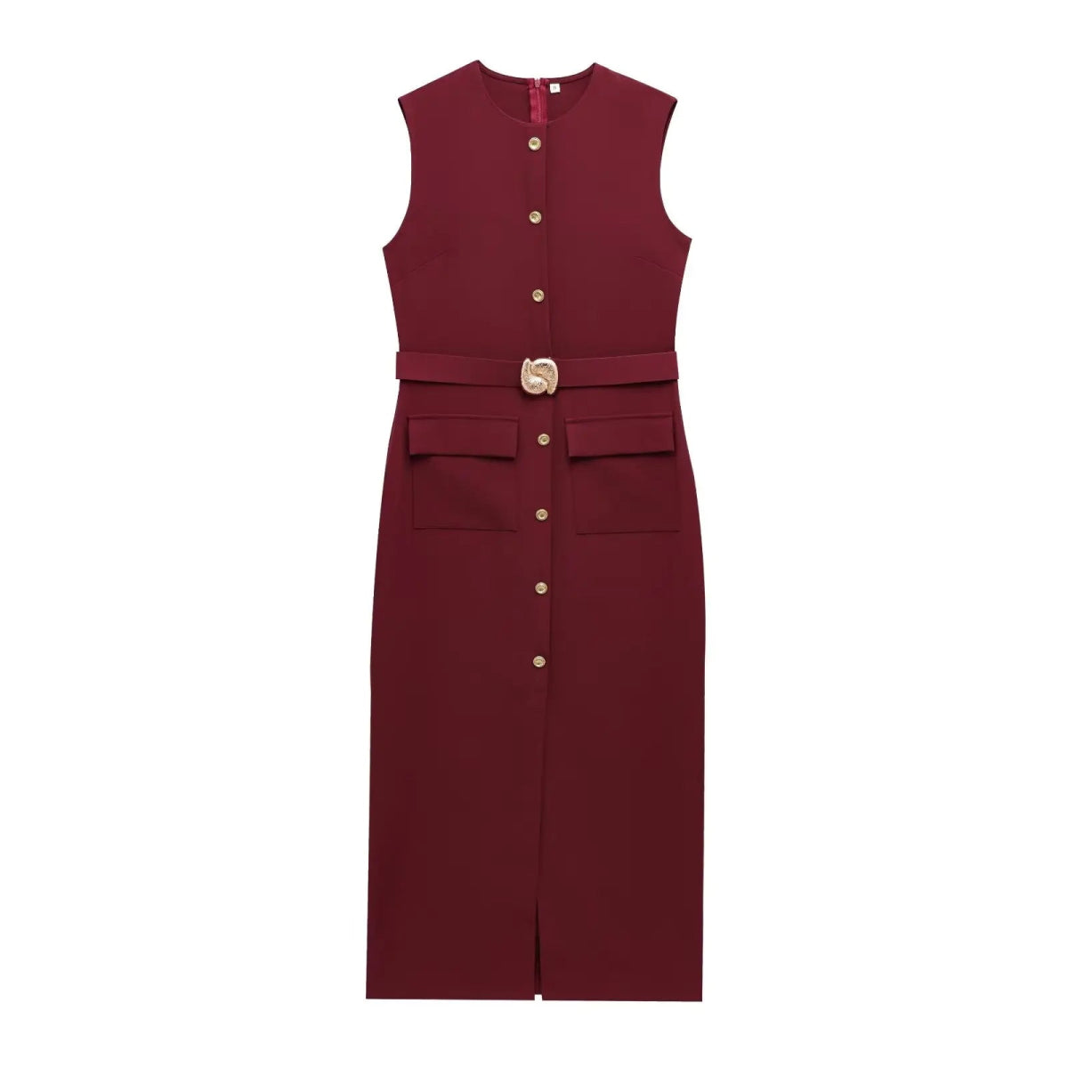 Design: Chic single-breasted dress with an O-neckline, sleeveless cut, and matching belt for a cinched empire waist. Button details add a touch of sophistication.