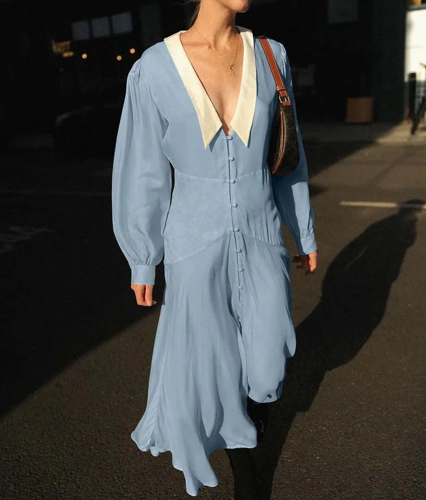 Design: A casual mid-calf dress featuring a turn-down collar, full-length sleeves, and a straight silhouette. The single-breasted closure and patchwork detailing bring subtle texture and charm to its laid-back, everyday look.