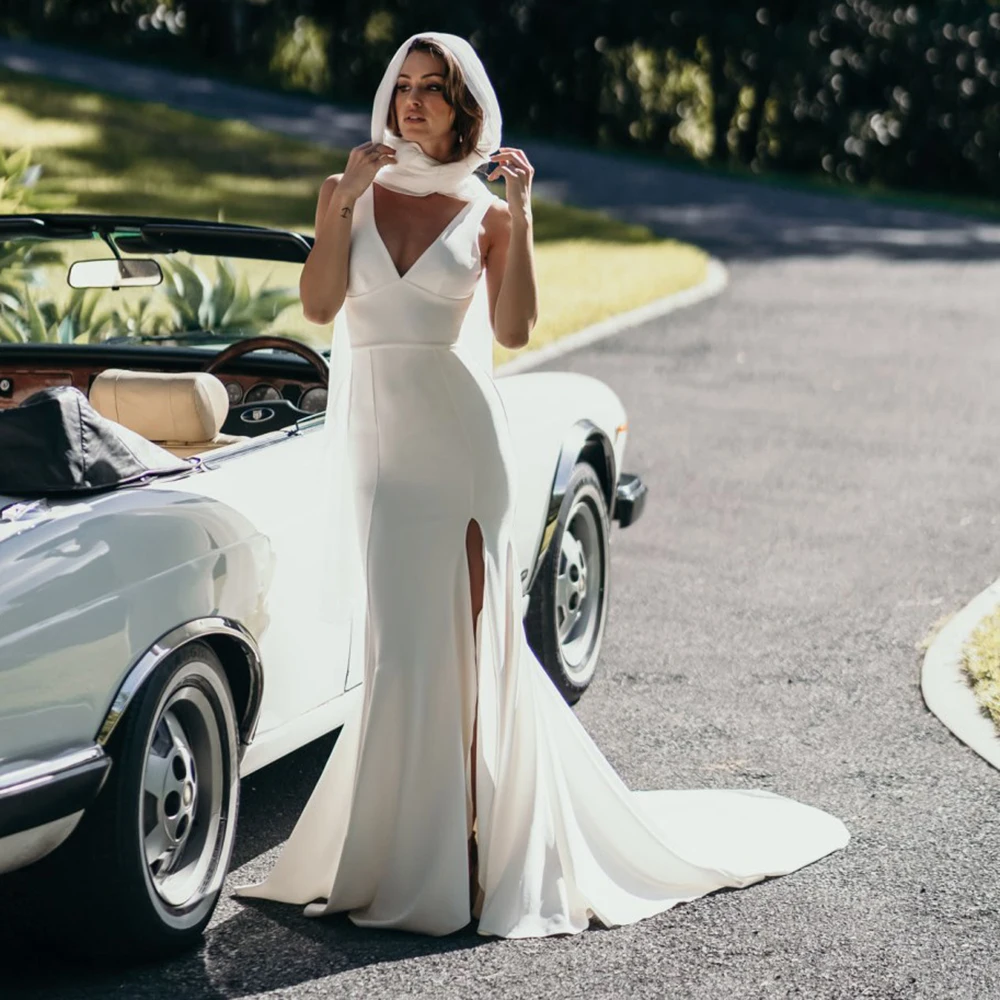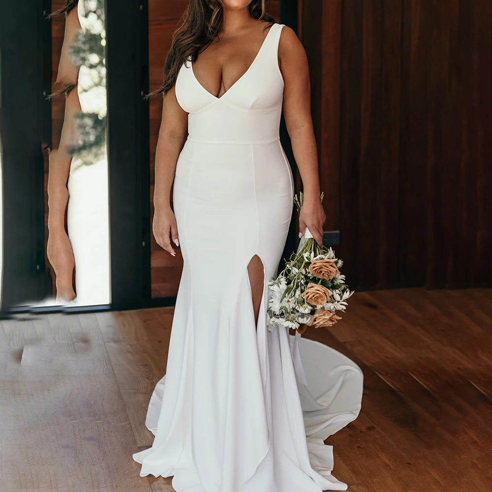 Vestido de novia ajustado de crepé con escote en V y abertura alta