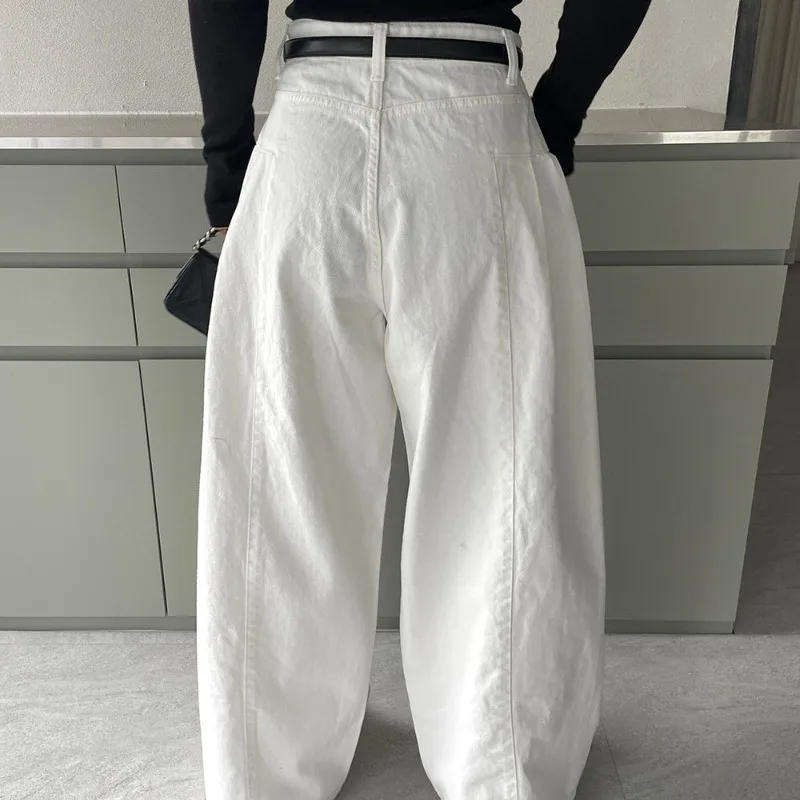 Pantalones vaqueros blancos de cintura alta para mujer con un diseño sencillo y vanguardista. Estos pantalones de corte holgado y pierna ancha inspirados en el Y2K tienen un ligero estiramiento para mayor comodidad y un largo hasta los tobillos. Están confeccionados en algodón y licra, con cierre de botones y fajas decorativas, perfectos para usar en la oficina en primavera y verano.