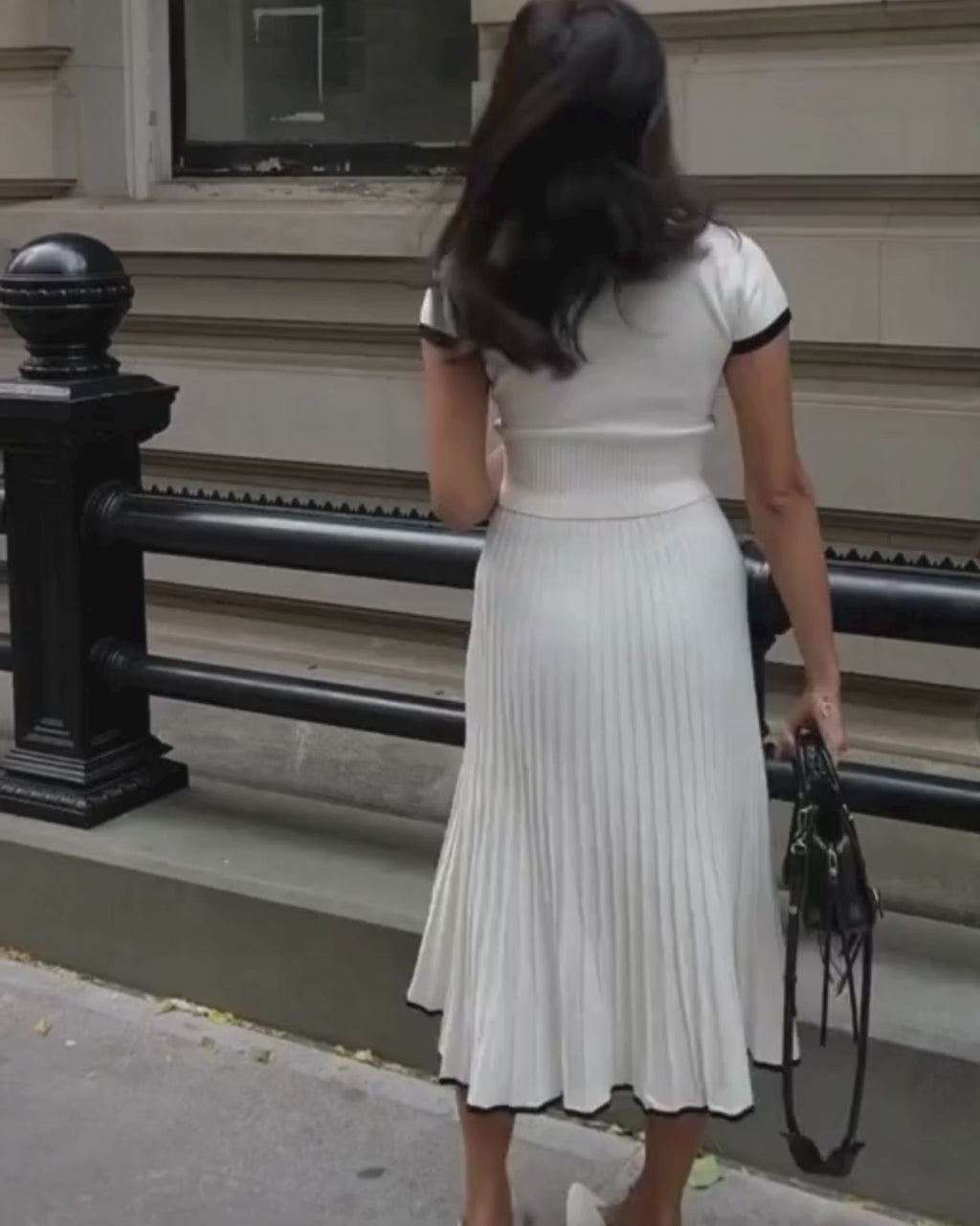 Adéntrate en el estilo de la calle con este elegante conjunto de dos piezas, que incluye un top corto moderno y una falda acampanada hasta la mitad de la pantorrilla. Confeccionado en un tejido de poliéster mezclado, el conjunto presenta un elegante patrón de rayas con decoraciones plisadas y dobladas para un aspecto moderno. El top de manga corta tiene un favorecedor diseño de escote en V, mientras que la falda tiene una cintura elástica para mayor comodidad y facilidad. Perfecto para salidas informales o eventos elegantes, este conjunto de corte ajustado es un imprescindible en tu armario.
