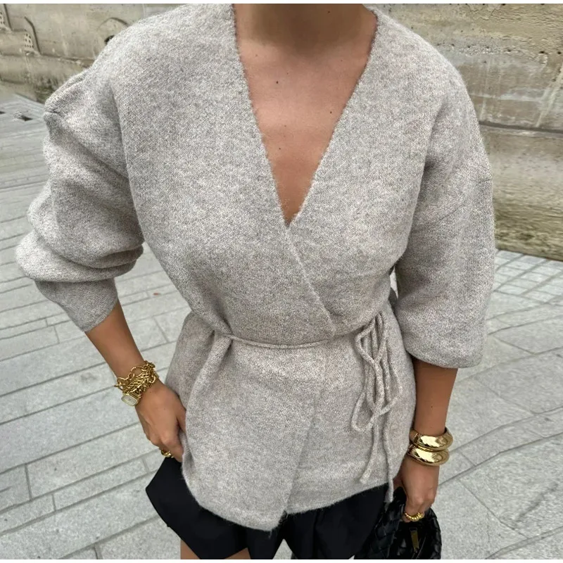 Cárdigan de punto con cordones para mujer: abrigo corto holgado con cuello en V para otoño/invierno