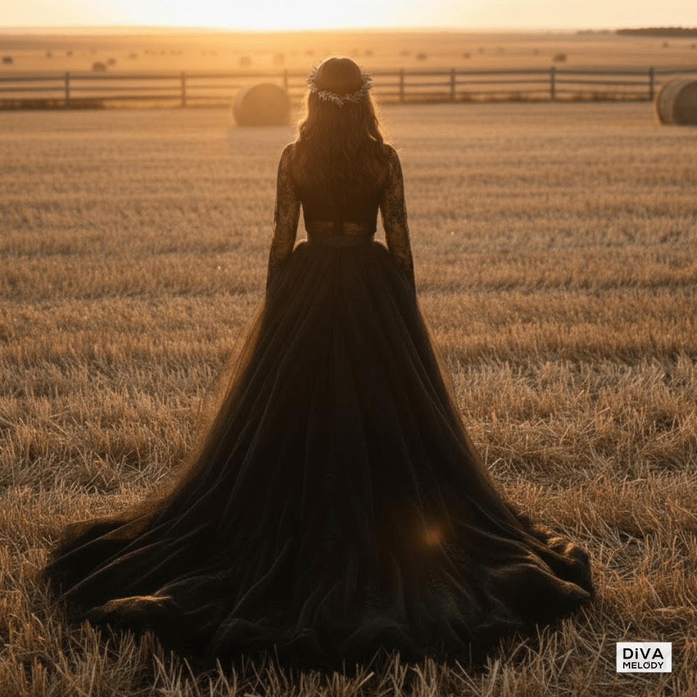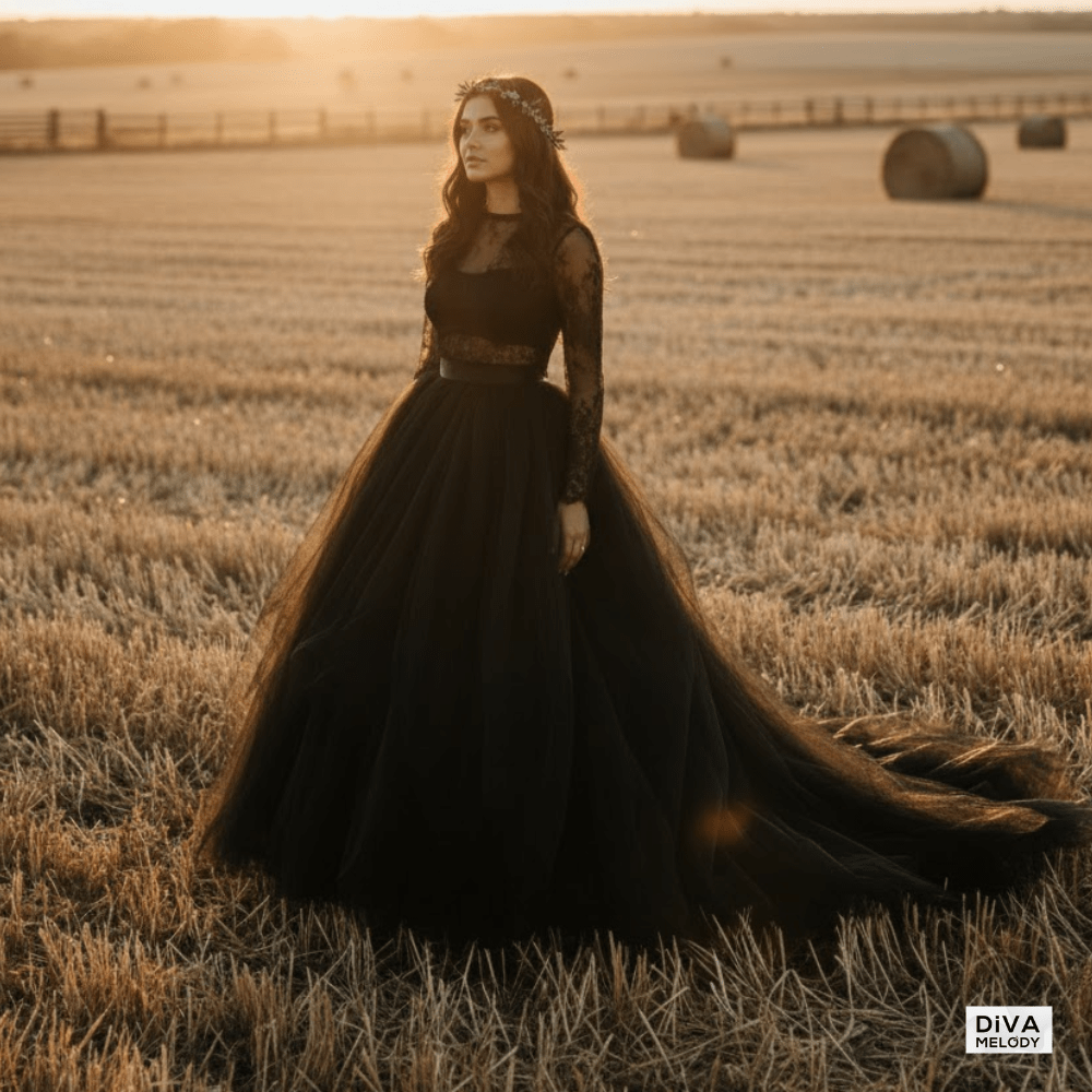 Atrévete a ser atrevida con este moderno vestido de novia negro de dos piezas, perfecto para una boda con temática de Halloween. El top corto de encaje presenta un escote barco, mangas largas regulares y un elegante detalle de botones en la espalda. Combinado con una falda de tul esponjosa, esta silueta en forma de A hasta el suelo crea un look dramático y elegante. Los volantes y los detalles de encaje añaden un toque romántico, mientras que la cola amplia completa el diseño con gracia. Totalmente personalizable con un sujetador incorporado para mayor comodidad y sujeción, este conjunto de novia alternativo es ideal para la novia poco convencional.